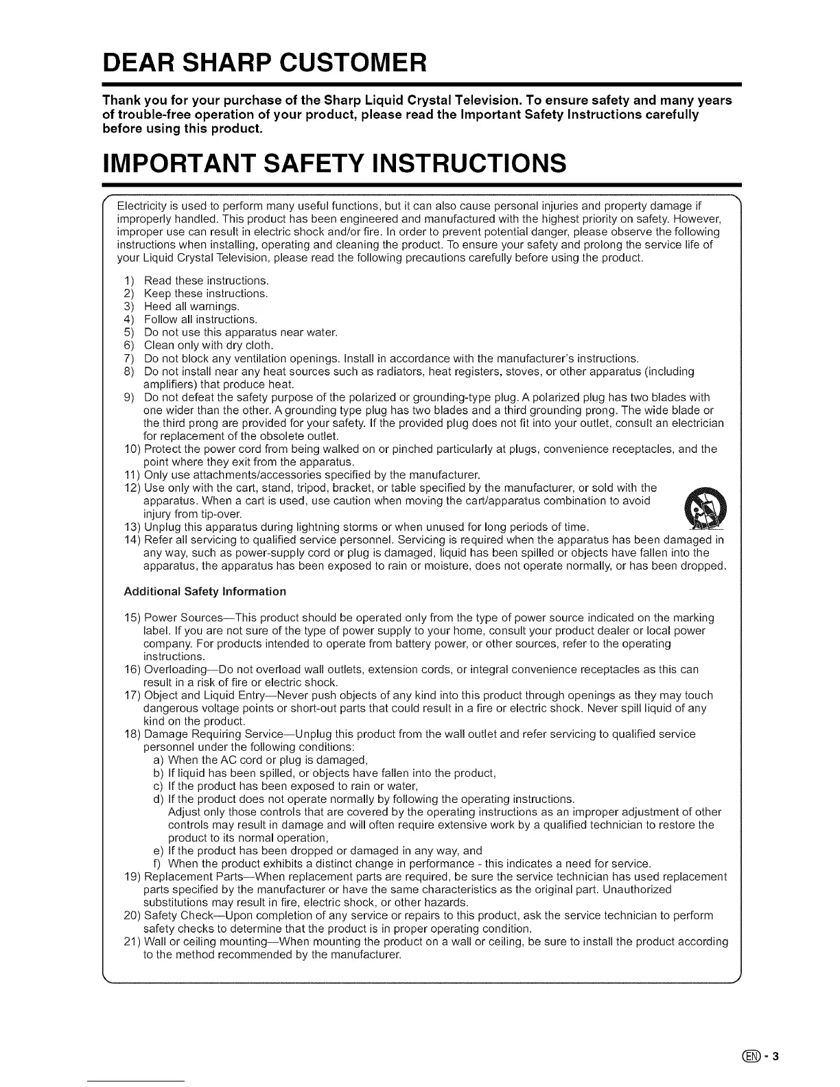 Thank you for your purchase of the Sharp Liquid Crystal Television. To ensure safety and many years