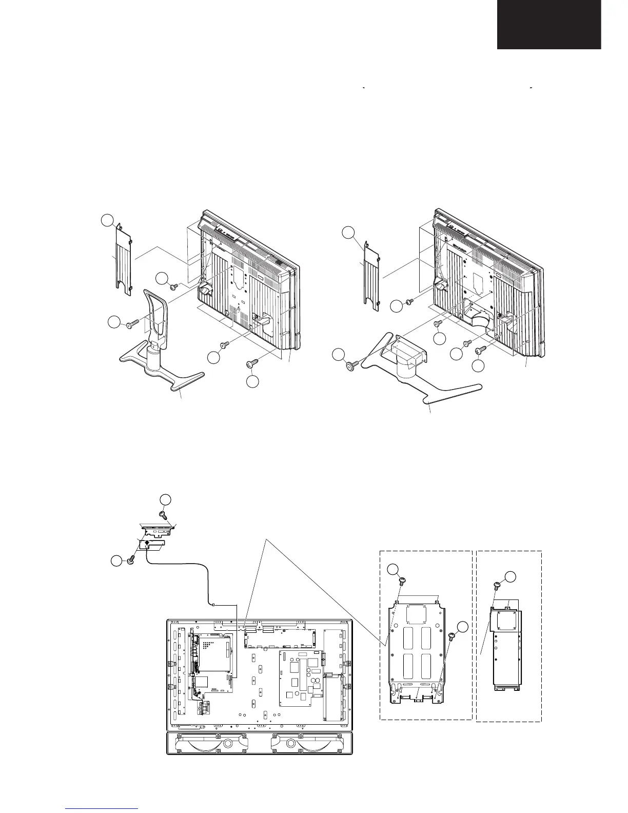 5. Remove the 4 (LC-26GA5E) / 7 (LC-32GA5E) lock screws 6 and detach the Center Angle.