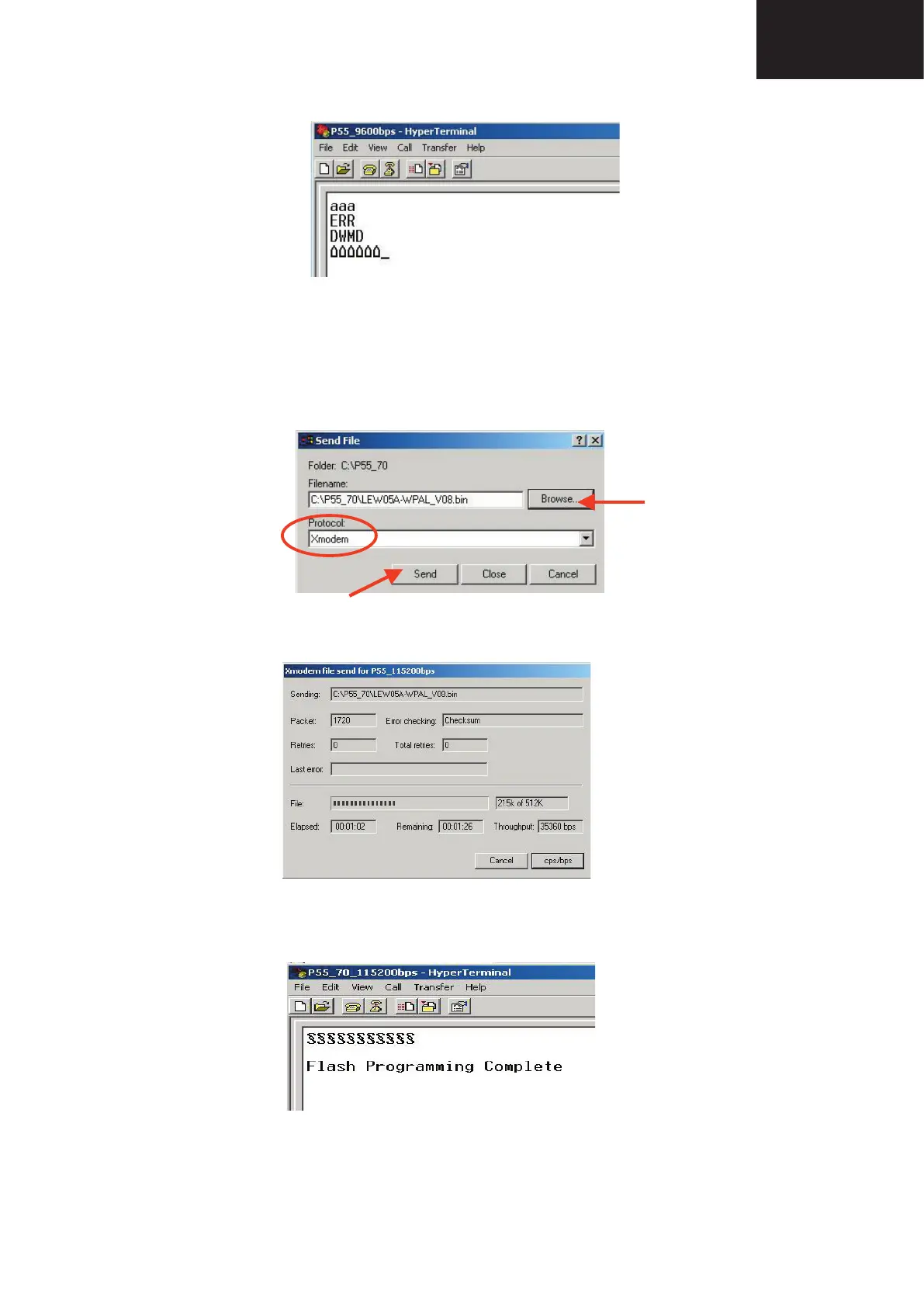 4. Using “Transfer\Send fi le…” menu, select desired fi le (.bin format) and the transmission protocol (Xmodem) as