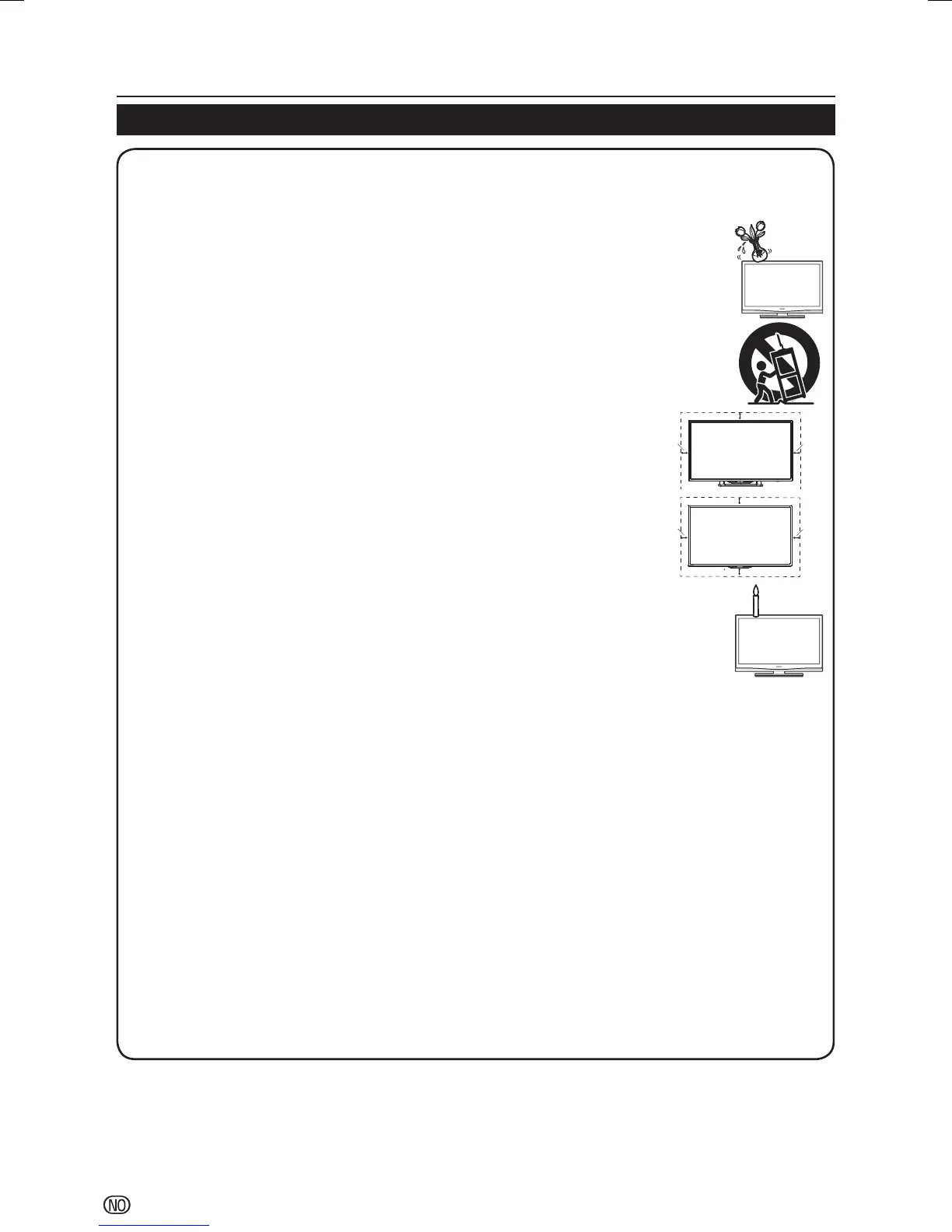 • For å forhindre brann eller fare for støt, må strømledningen ikke plasseres under TV-en eller