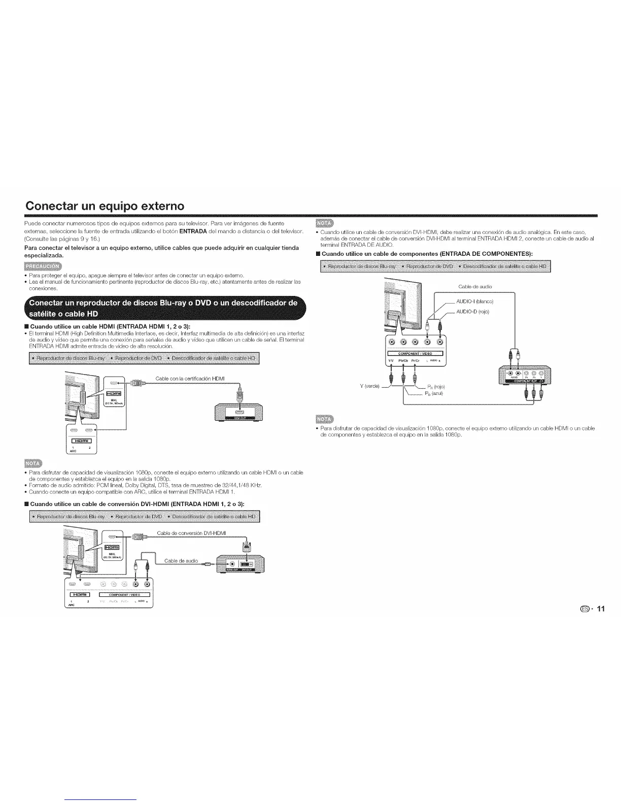 • Para disfrutar de capacidad de visualizaci6n 1080p, conecte el equipo externo utilizando un cable HDMI o un cable