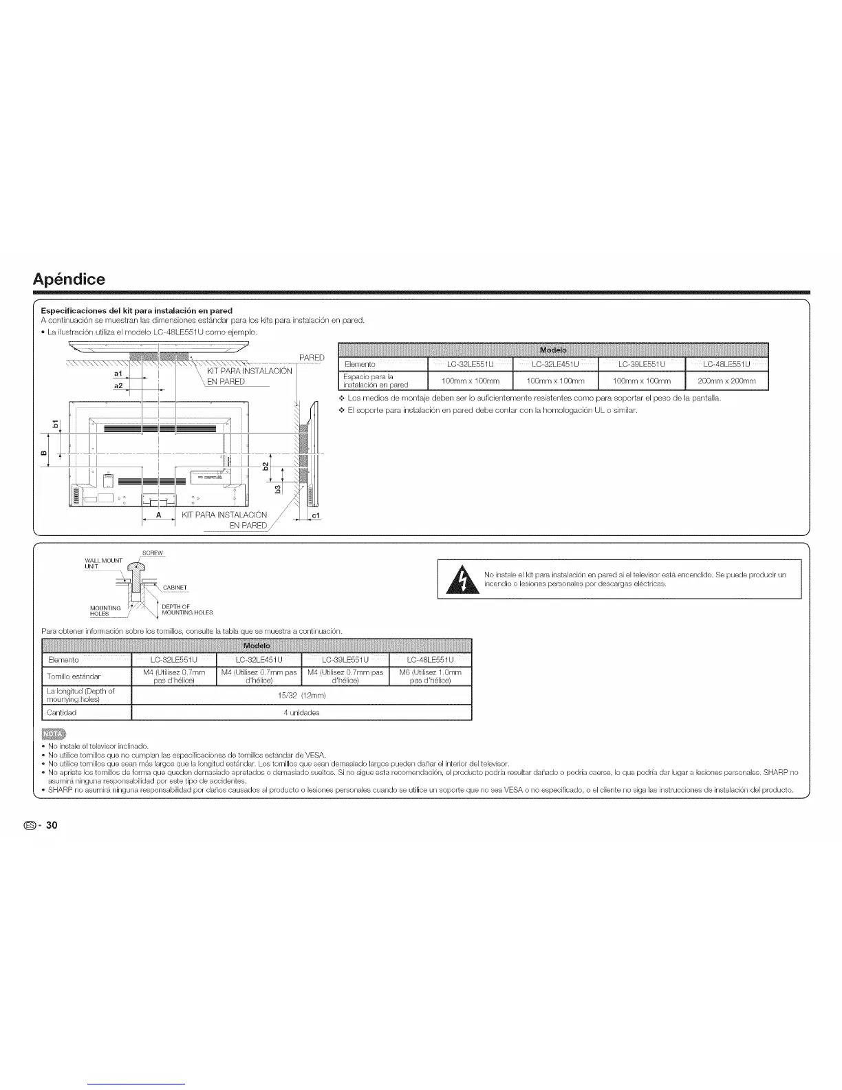 • No utilice tornillos que sean mas largos que la Iongkud estb, ndar. Los tornillos que sean demasiado largos pueden danar el interior del televisor.