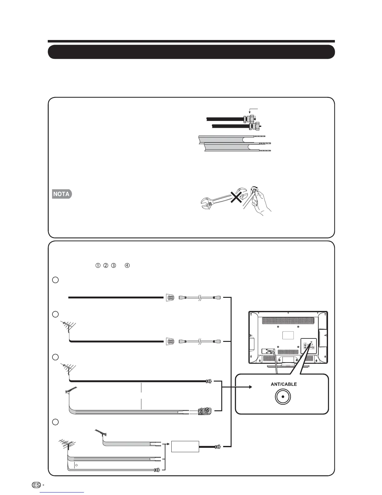Conecte el cable de la antena a la TV utilizando uno de los métodos que aparecen en la •