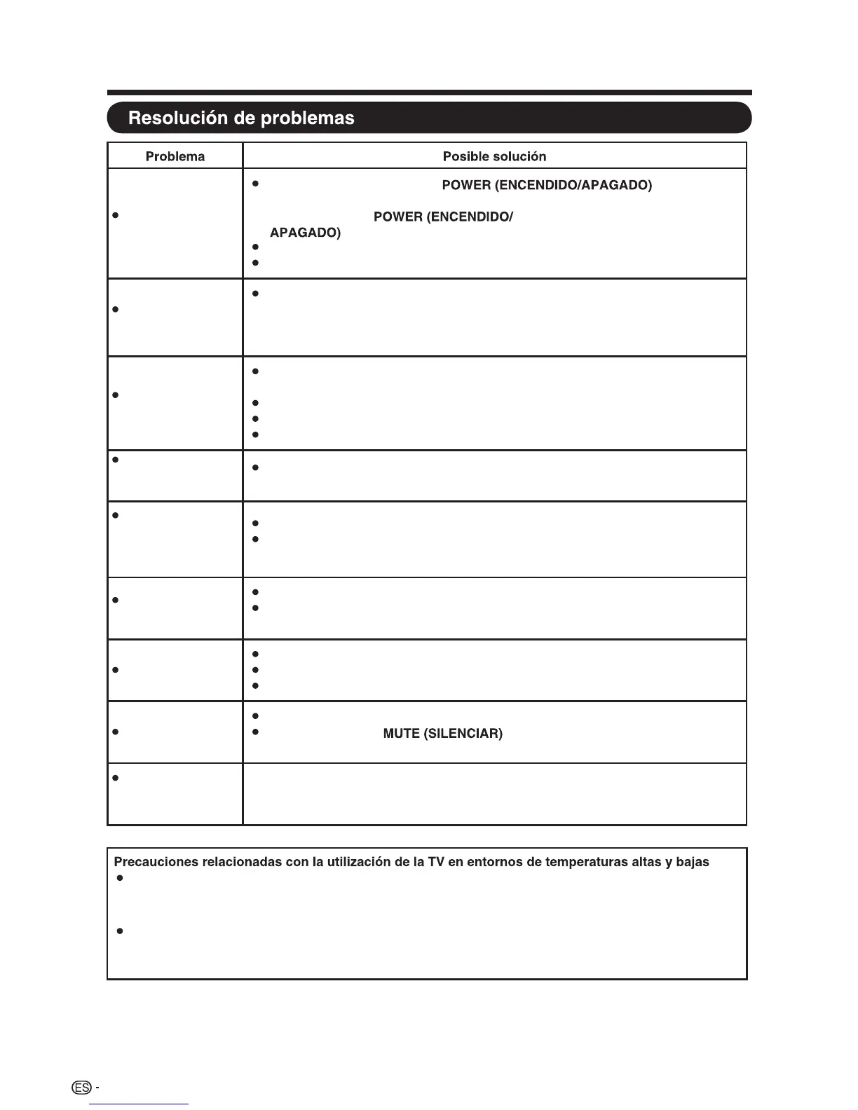 defectuoso. La TV se recuperará cuando la temperatura regrese a un valor normal.