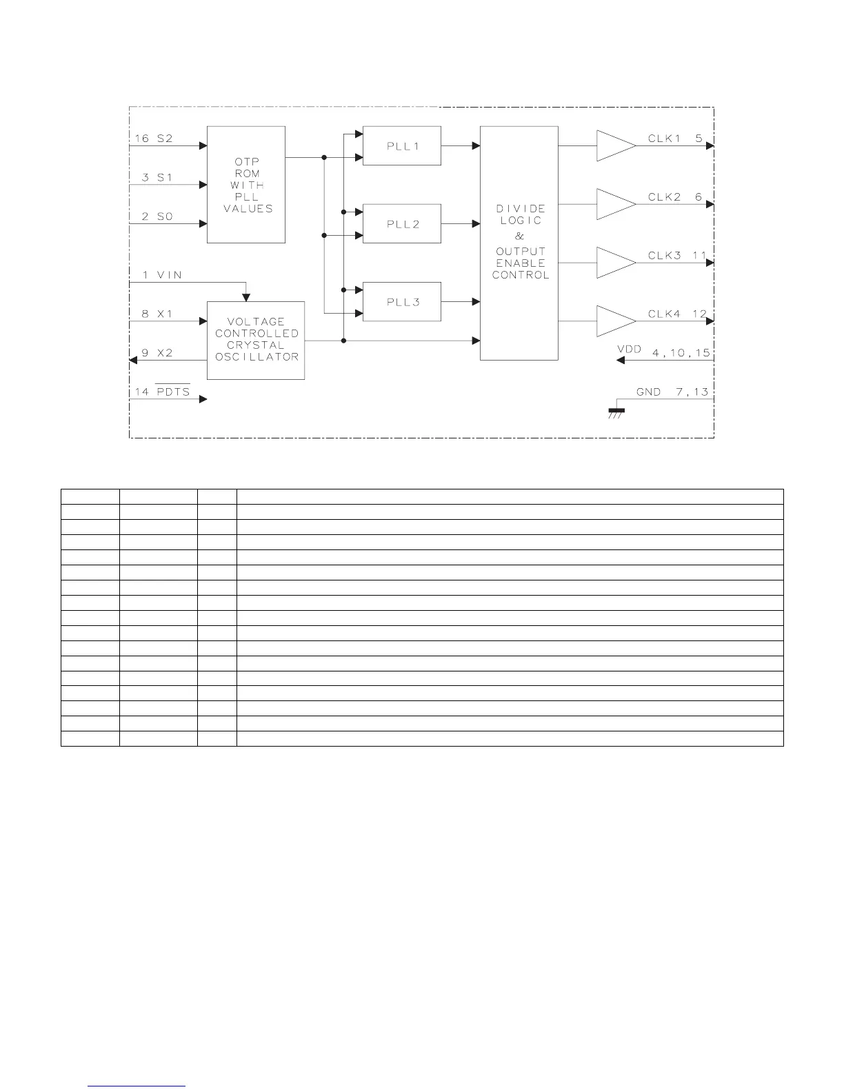 14 PDTS I Power-down tri-state. Powers down entire chip and tri-states clock outputs when low. Internal pull-up resistor.