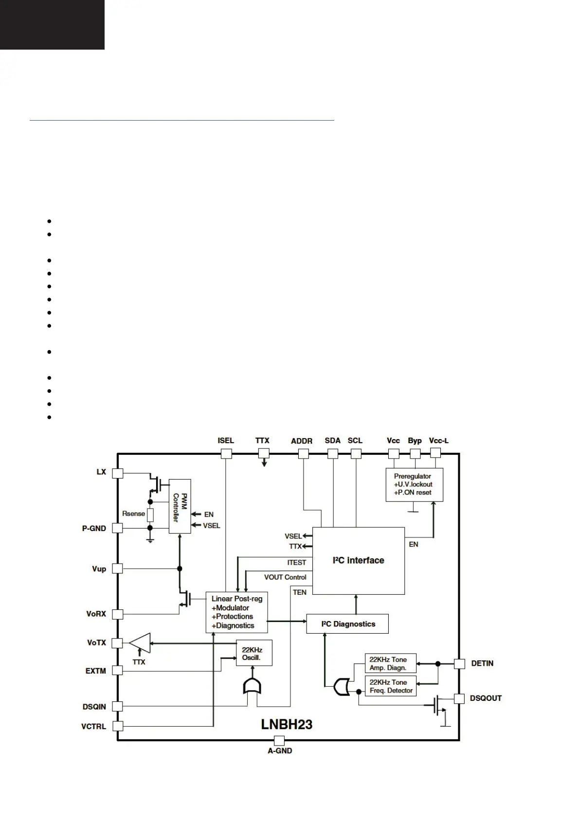 Intended for analog and digital satellite receivers/sat-TV, sat-PC cards, the LNBH23 is a monolithic voltage regulator and