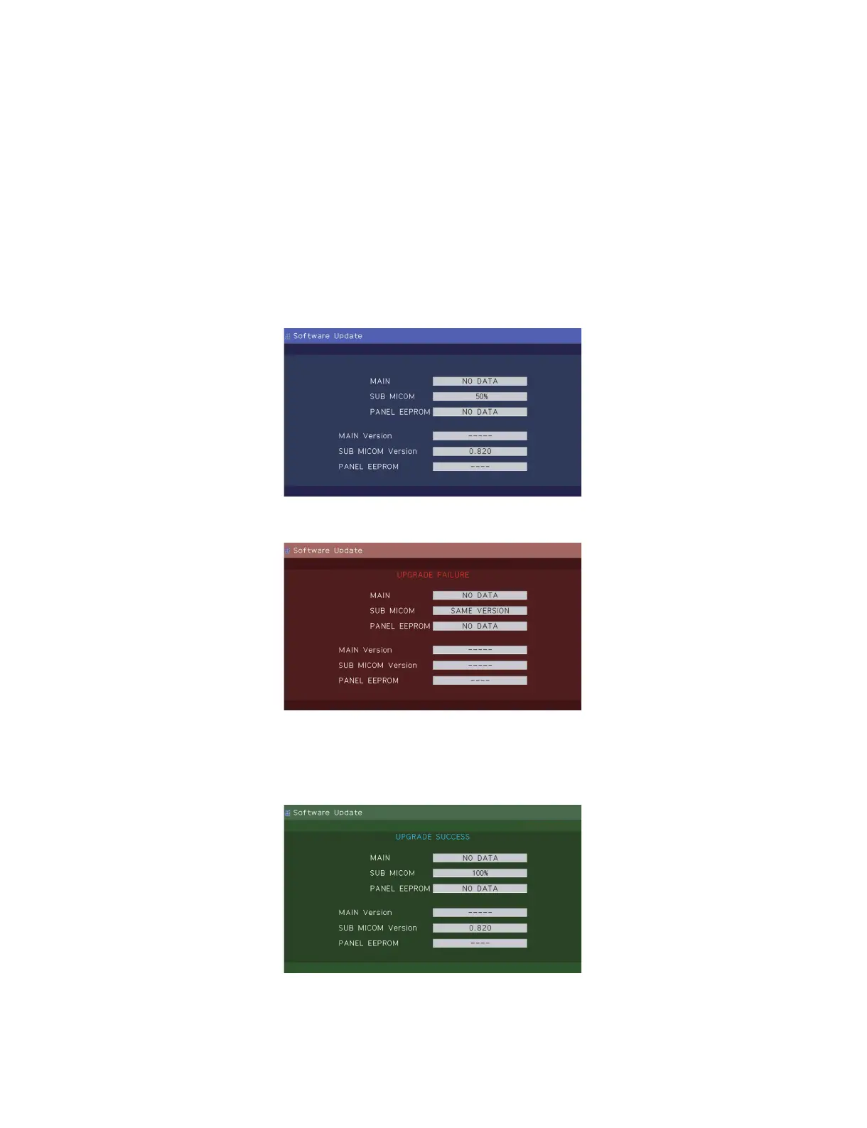 6. If the upgrade fails, power led will stop blinking. Also, the upgrade failure screen will be shown if upgrade screen was shown at 5.