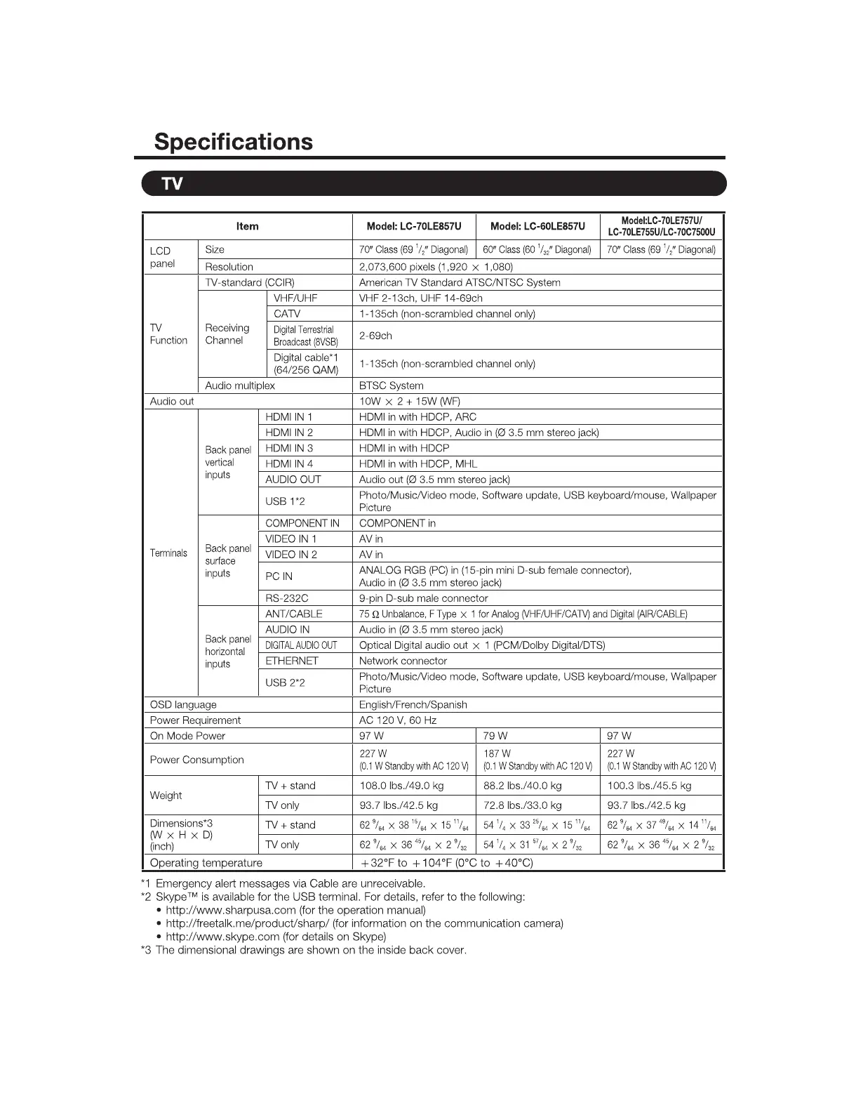 Sharp LC-60LE755U - Chapter 1. Specifications Specifications