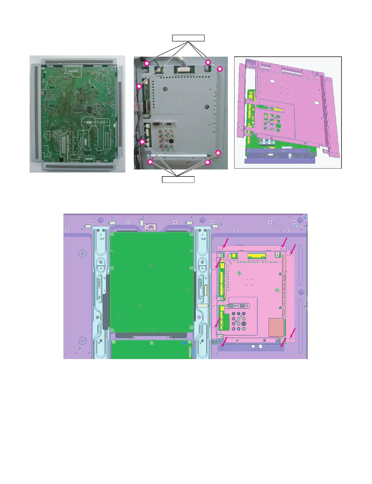The following is a drawing mounting the main PWB Ass’y on the backlight chassis. (The parts indicated by -> are the access holes for confirmation.)