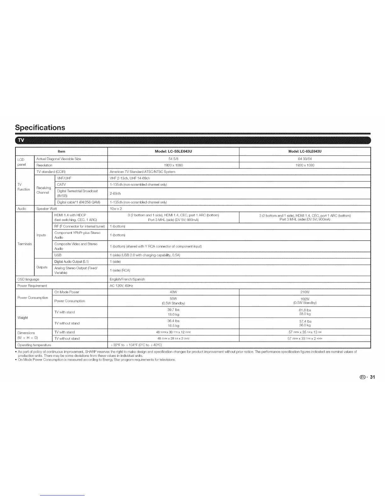 • On Mode Power Consumption is measured according to Energy Star program requirements for televisions.