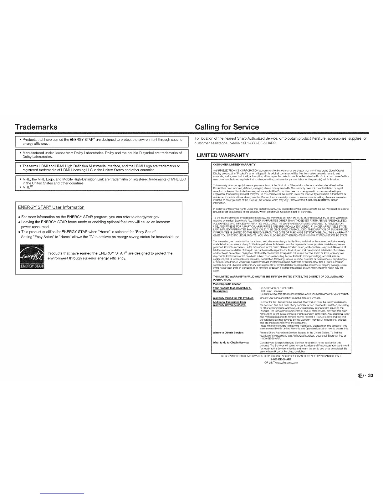 SHARP ELECTRONICS CORPORATION warrants to the first consumer purchaser that this Sharp brand Liquid Crystal