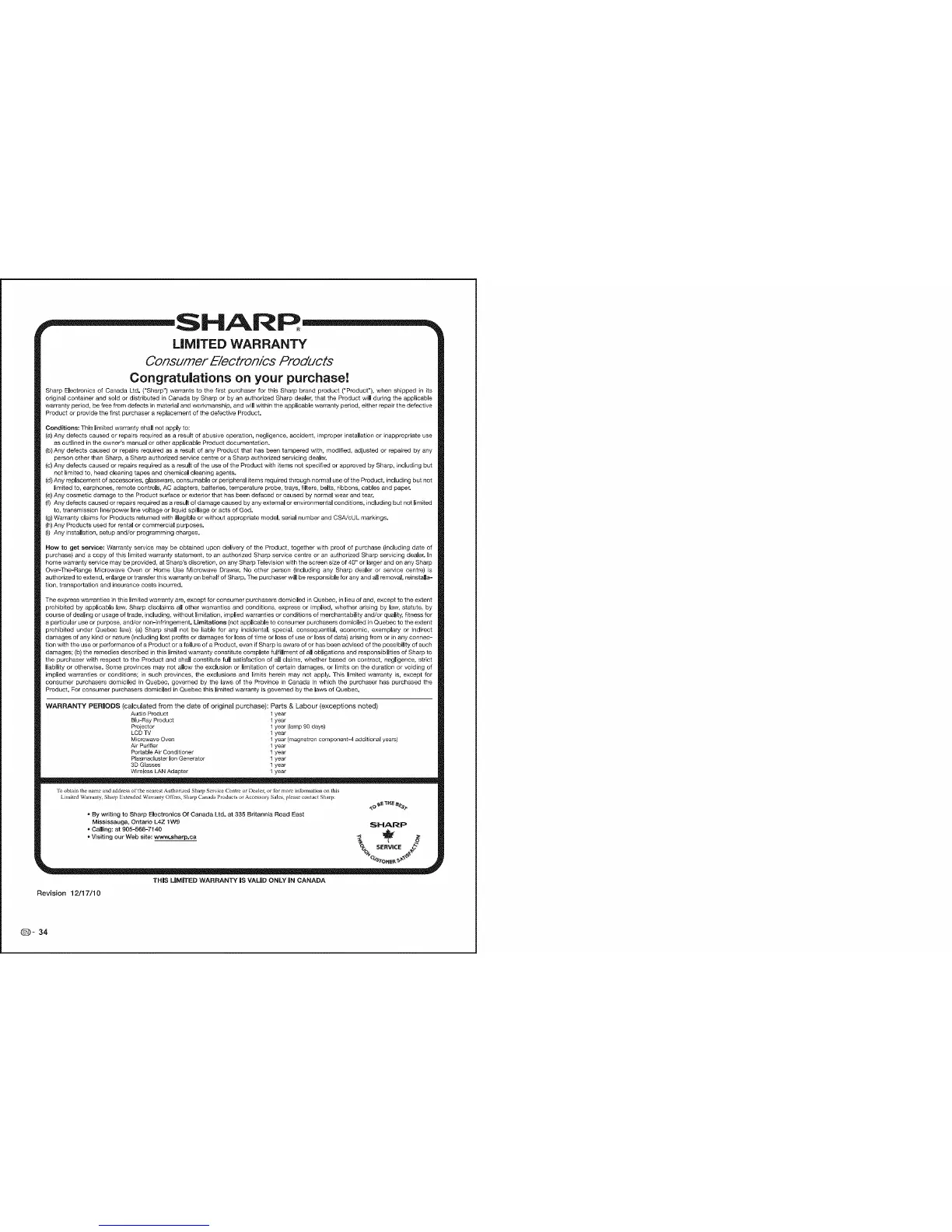 Sharp Electronics of Canada Ltd. ("Sharp") warrants to the first purchaser for this Sharp brand product ("Product"), when shipped in its