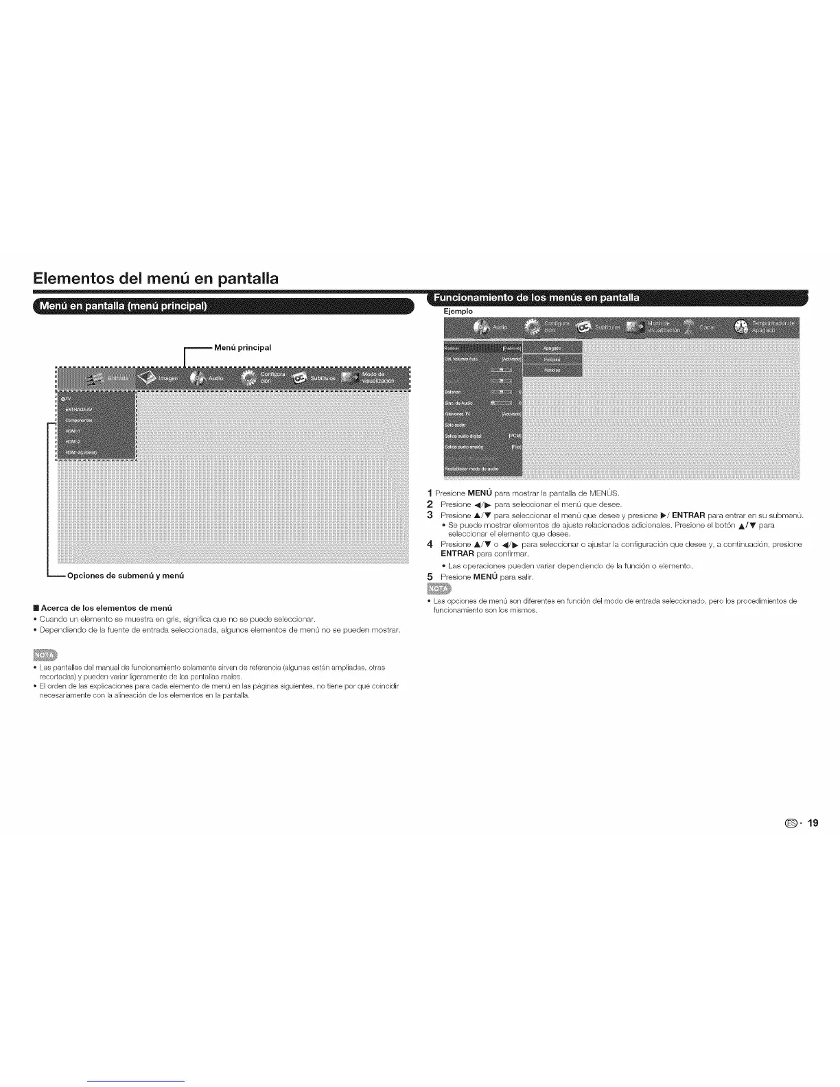 • Dependiendo de la fuente de entrada seleccionada, algunos elementos de men0 no se pueden mostrar,