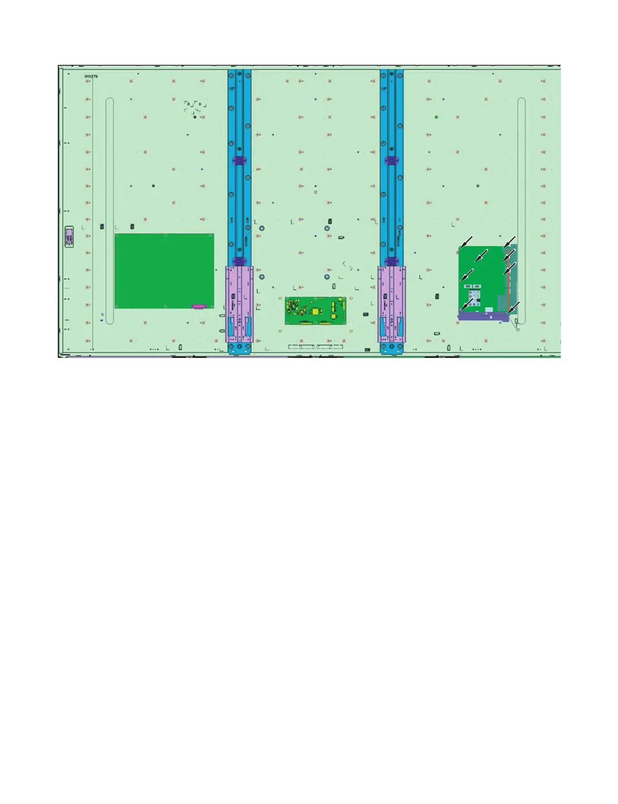 The following is a drawing mounting the main PWB Ass’y on the backlight chassis. (The parts indicated by -> are the access holes for confirmation.)