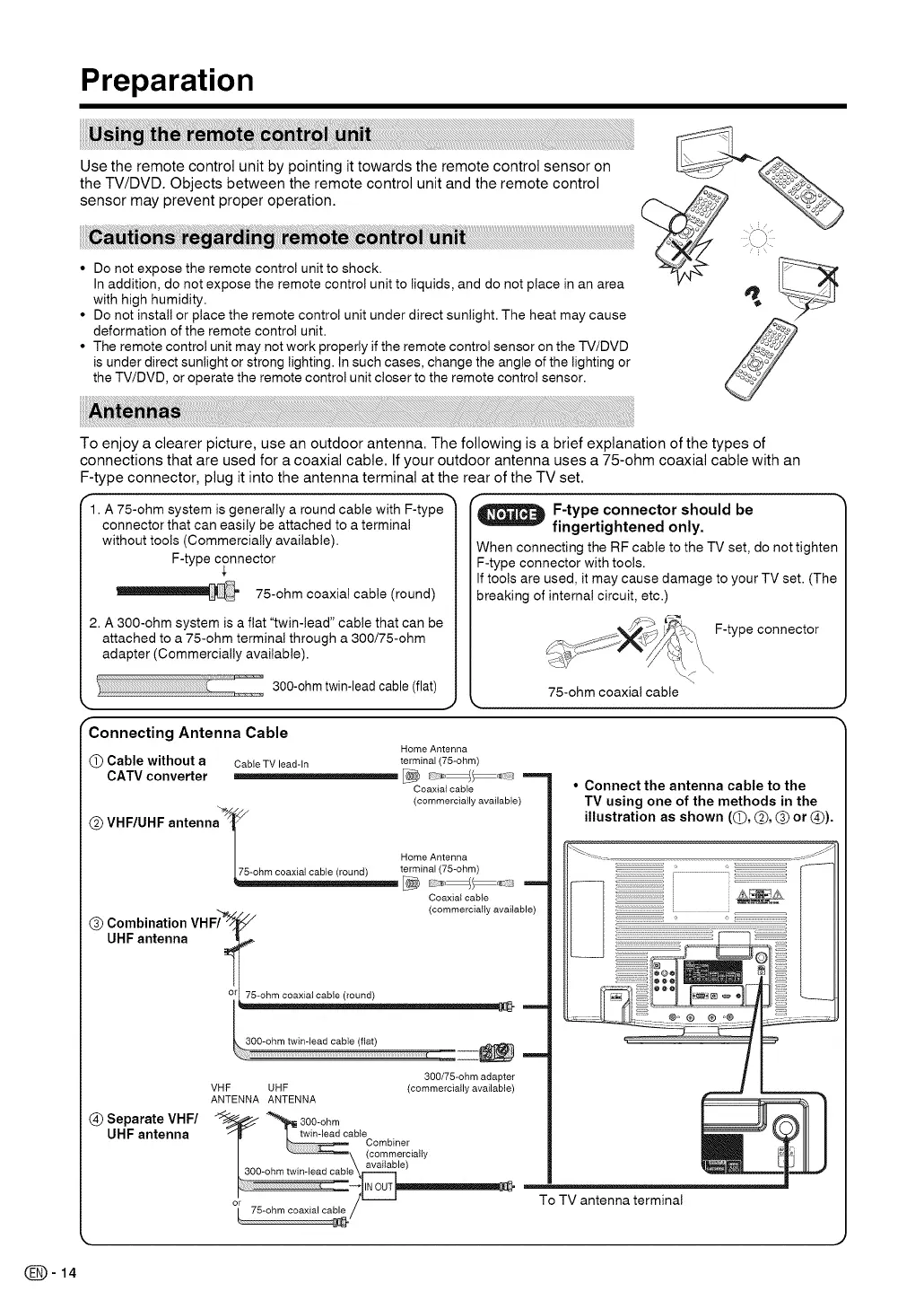 F-type connector, plug it into the antenna terminal at the rear of the TV set.
