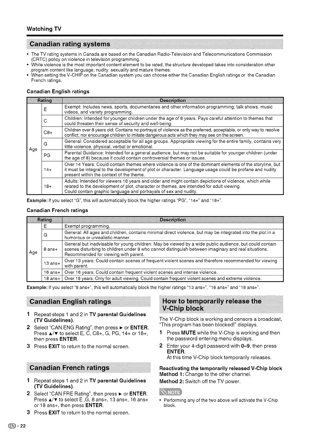 • When setting the V-CHIP on the Canadian system you can choose either the Canadian English ratings or the Canadian