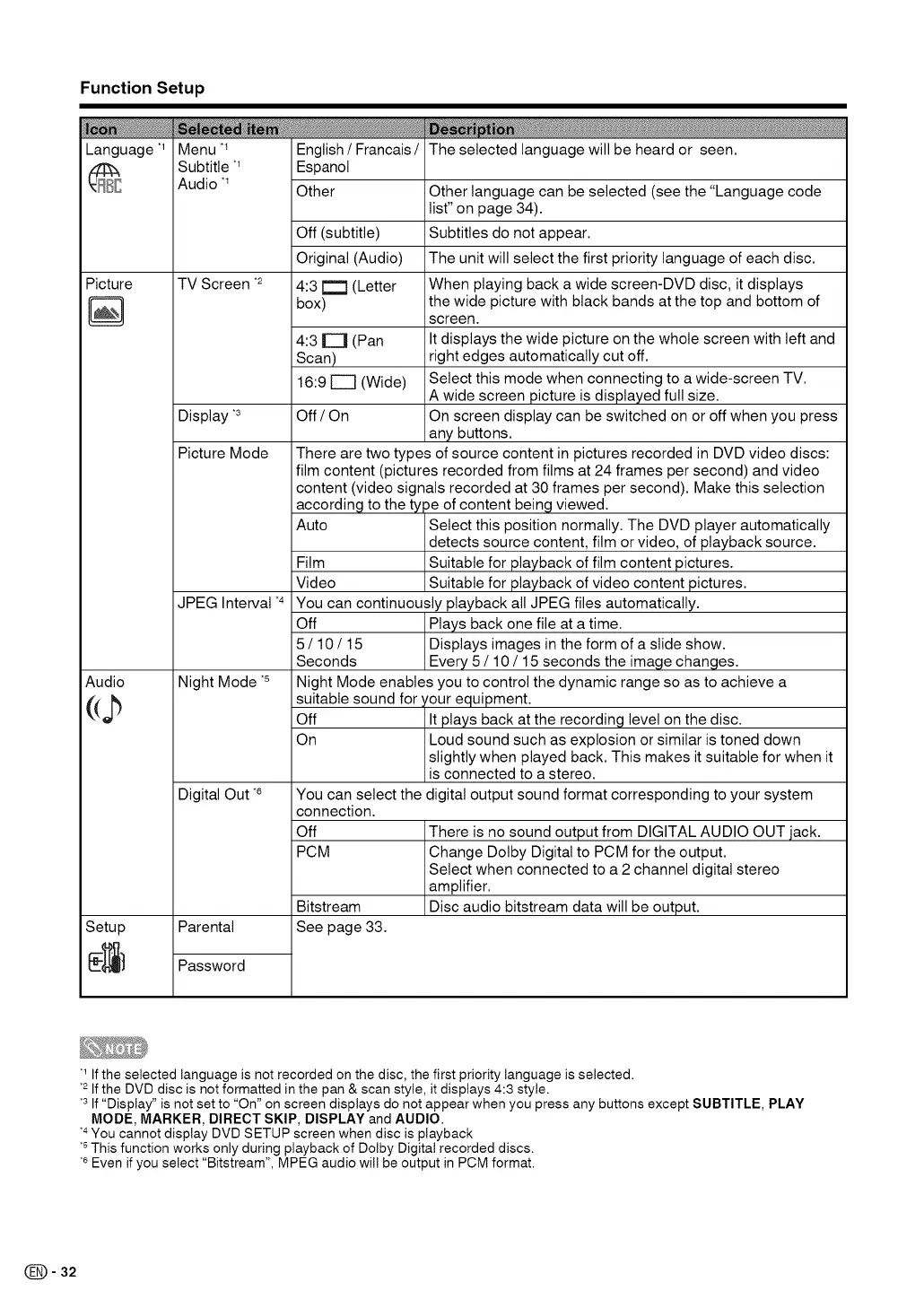 *2Ifthe DVD disc is not formatted in the pan & scan style, it displays 4:3 style.