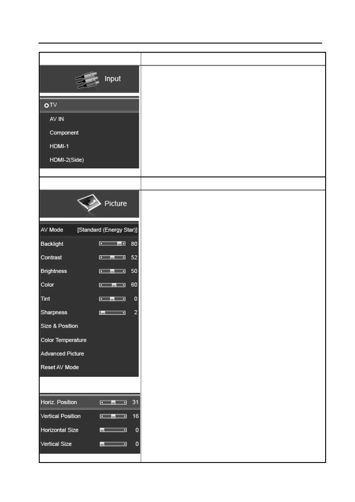 H. SIZE & POSITION (Horiz. Position/ Vertical Position/