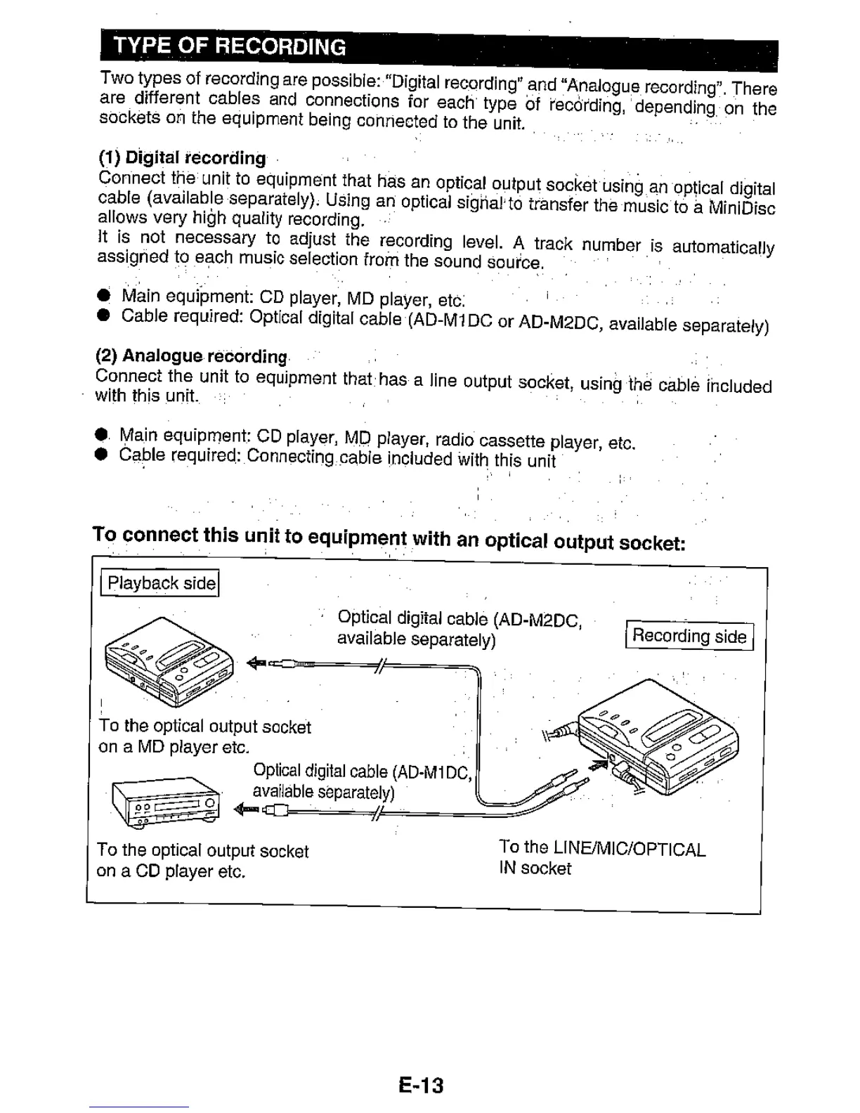 Sharp MD-M11A - Type of Recording; Digital Recording; Analogue Recording; To Connect the Unit to Equipment with an Optical Output Socket