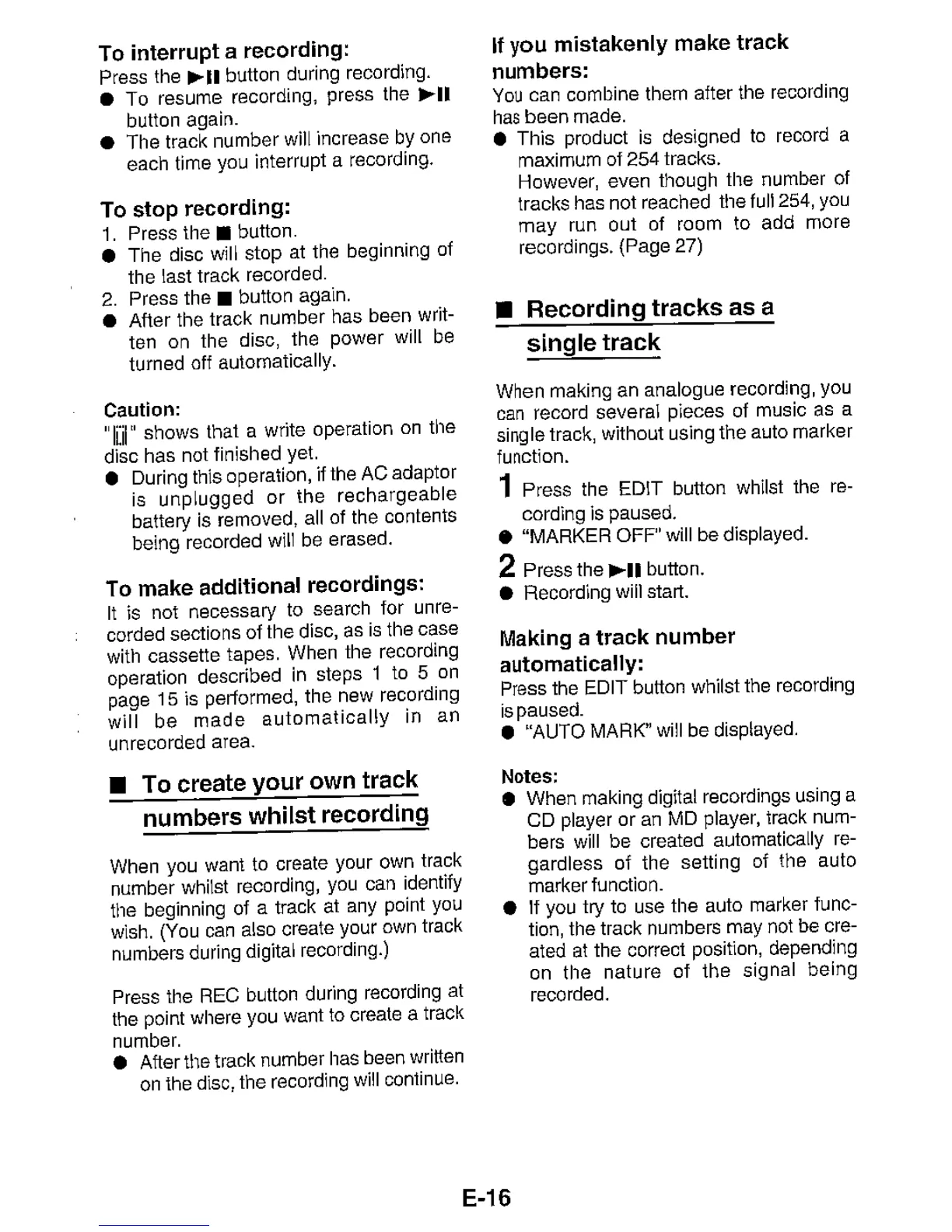 Sharp MD-M11A - To Create Your Own Track Numbers Whilst Recording; Recording Tracks as a Single Track; To Interrupt a Recording; To Stop Recording