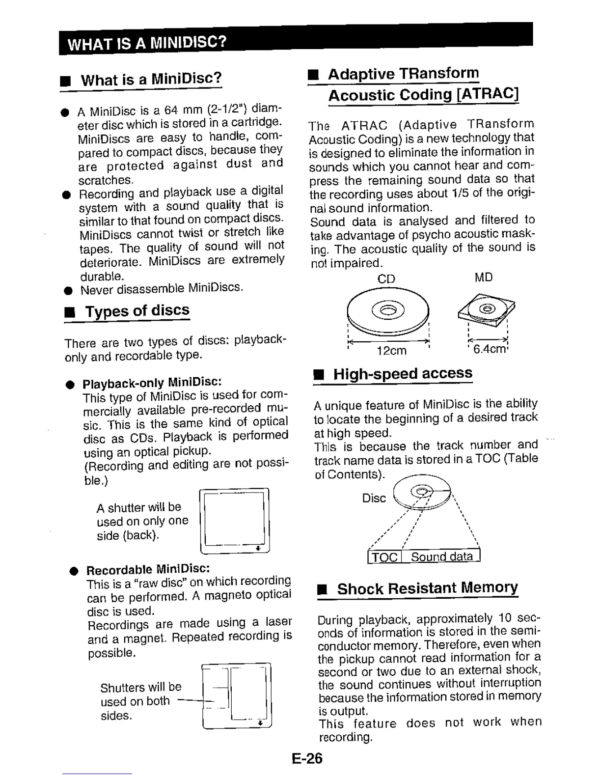Sharp MD-M11A - What Is a Minidisc?; Types of Discs; Adaptive Transform Acoustic Coding; High Speed Access