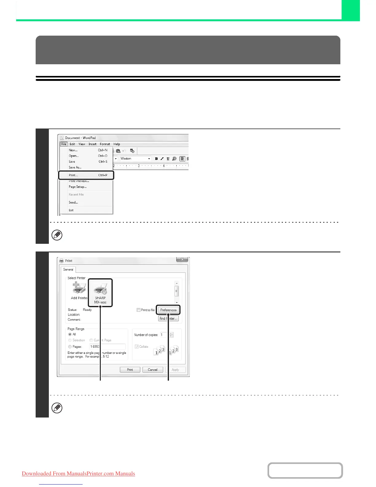 The following example explains how to print a document from "WordPad", which is a standard accessory program in