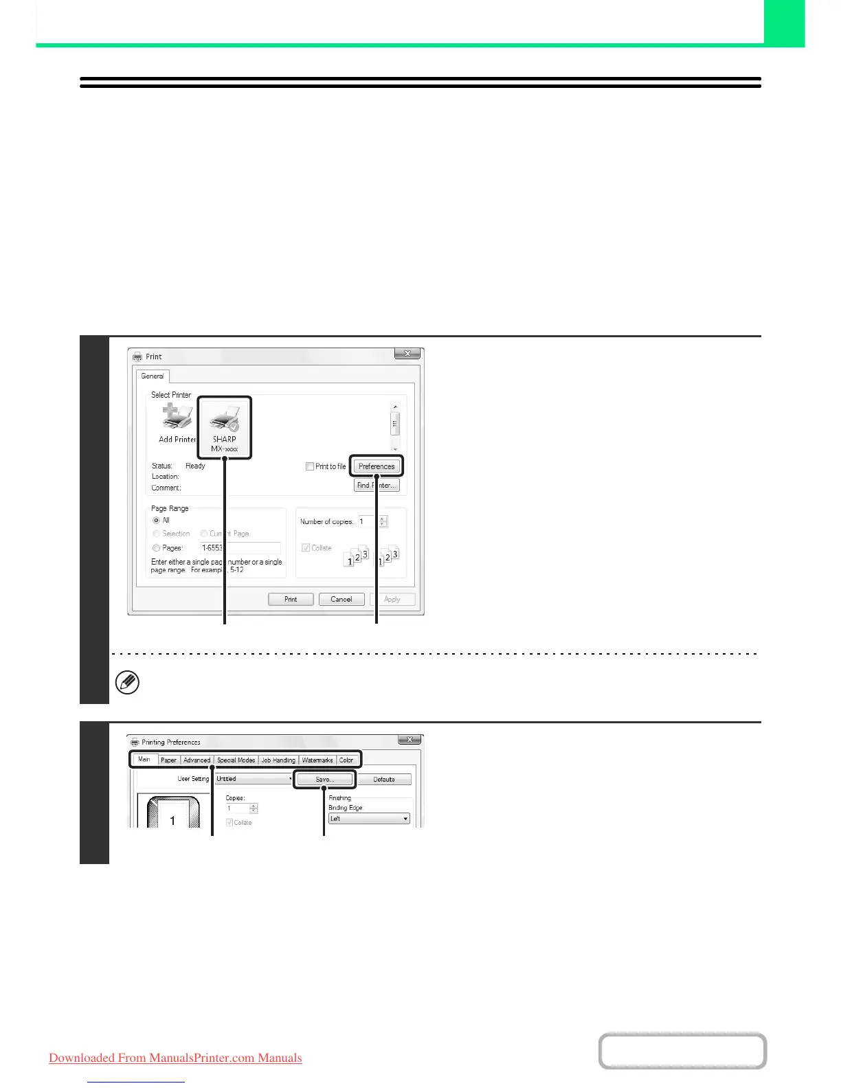 The button that is used to open the printer driver properties window (usually [Properties] or [Printing Preferences])
