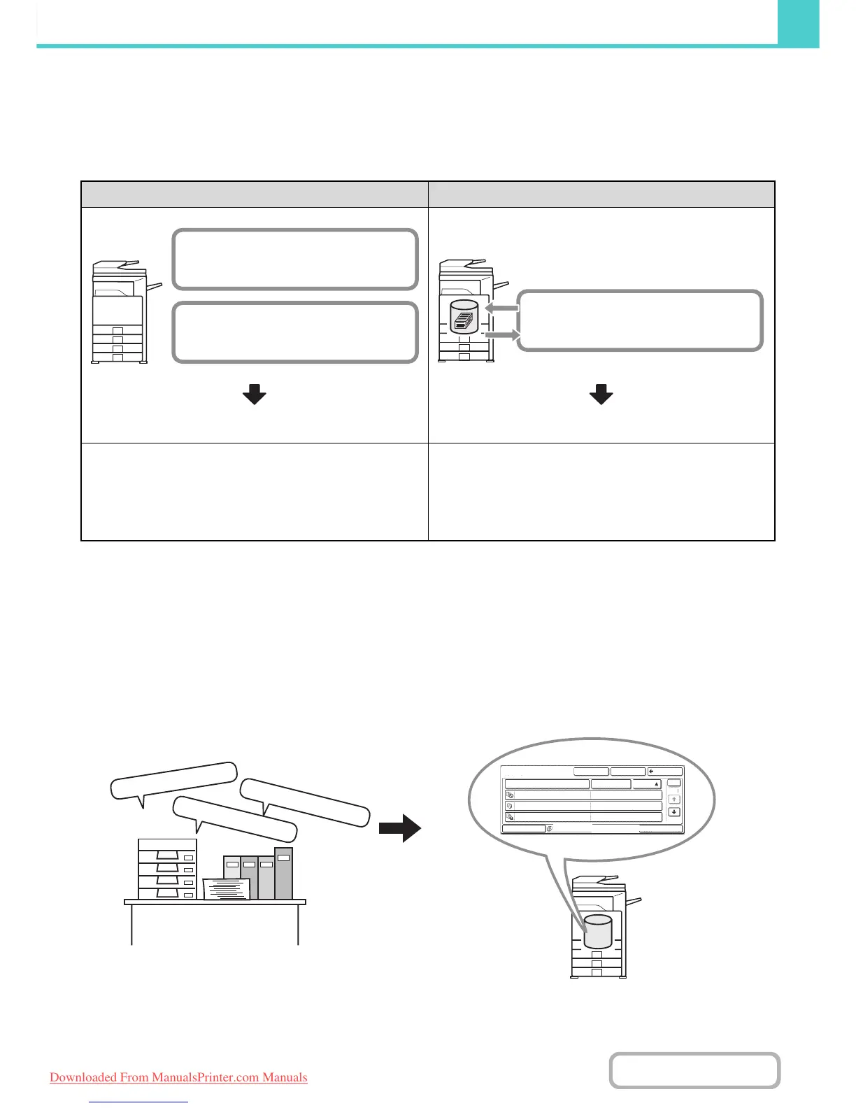 As shown in the example, storing a job with the document filing function frees you of the need to rescan the original and