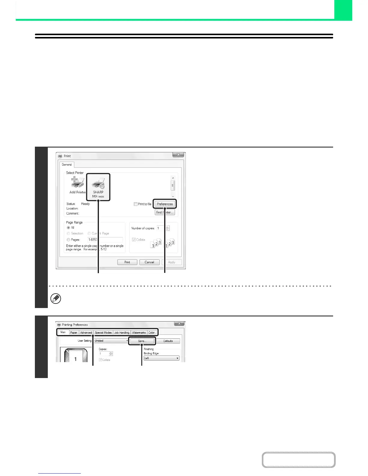 Settings configured on each of the tabs at the time of printing can be saved as user settings. Saving frequently used