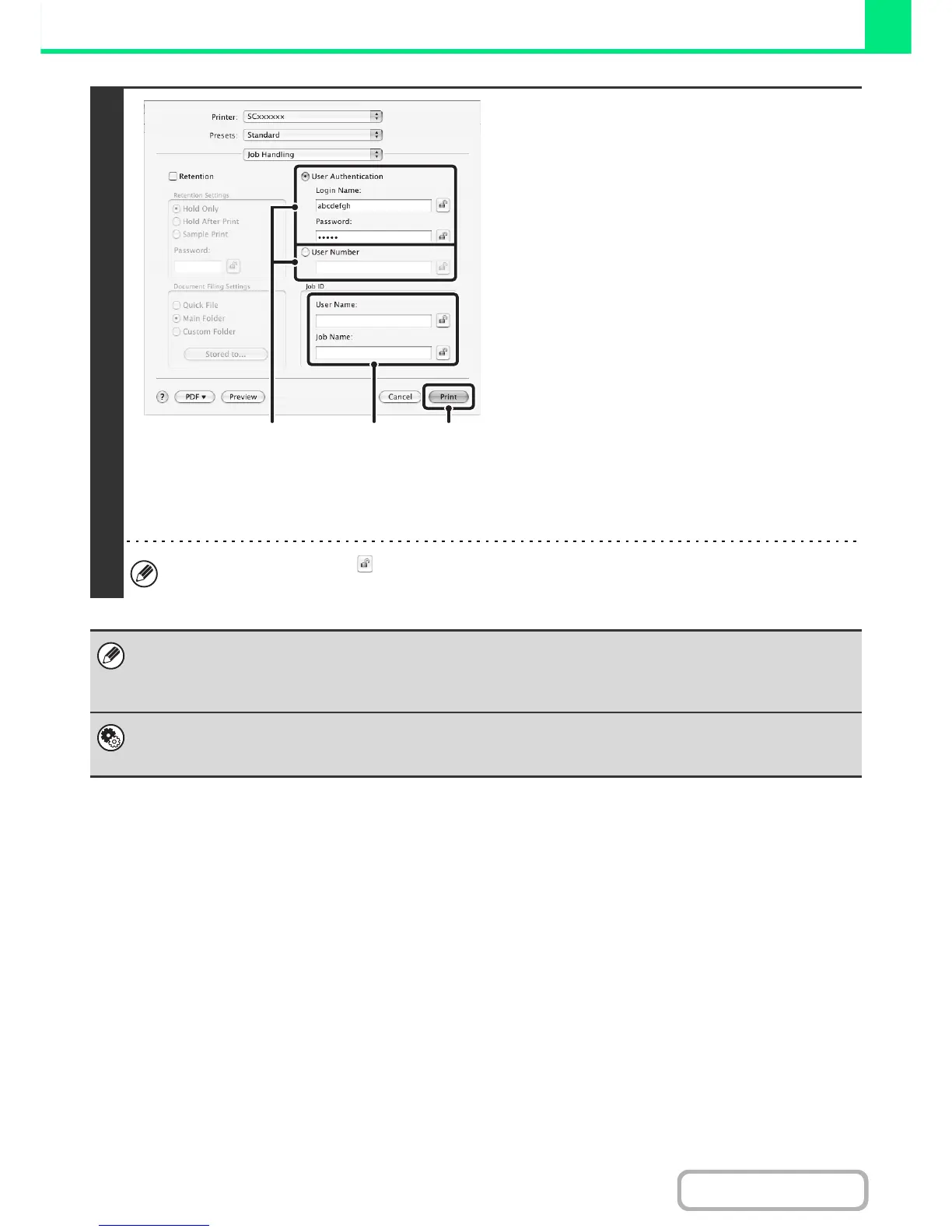 When user authentication is enabled in the system settings (administrator), printing is possible without entering user