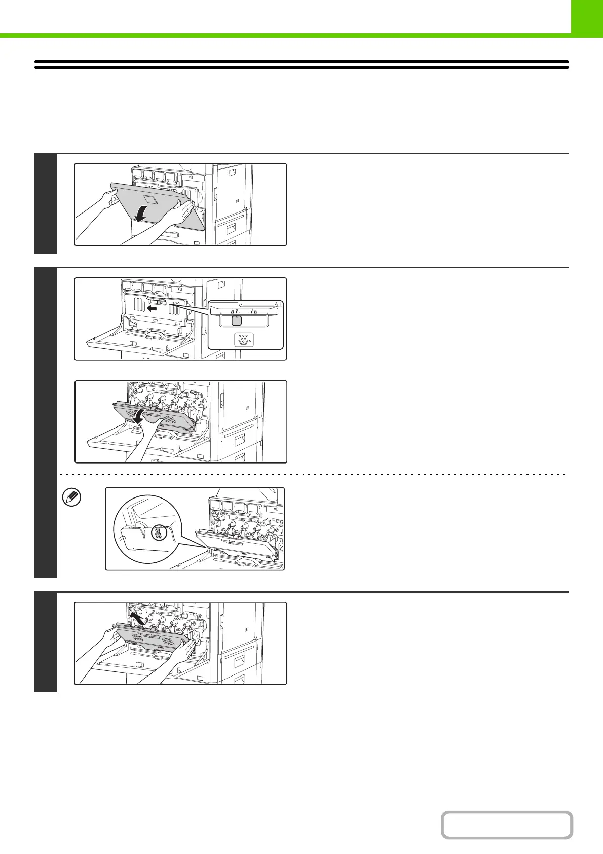 "Replace used toner container." will appear. Follow the procedure below to replace the waste toner box.
