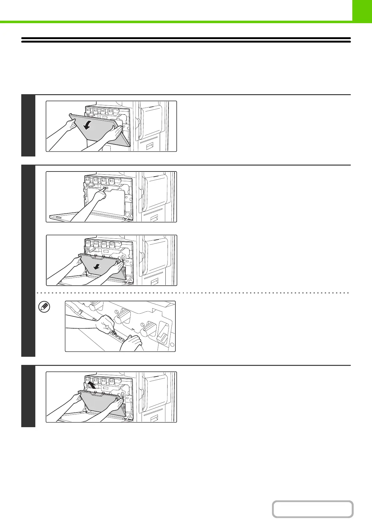 "Replace used toner container." will appear. Follow the procedure below to replace the waste toner box.