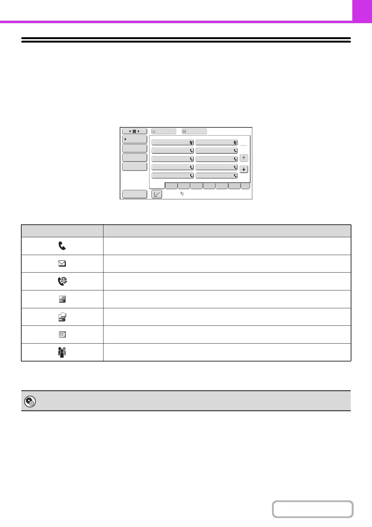 When destinations of other scan modes are stored in addition to fax destinations, an icon indicating the mode appears