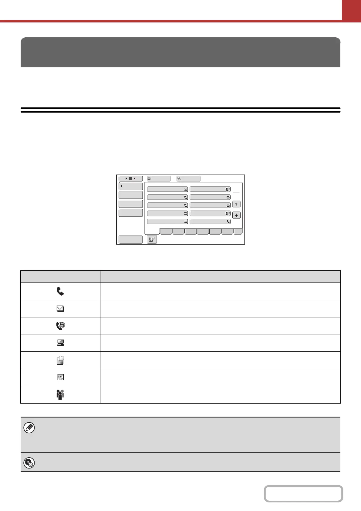 The address book screen shows the destinations of all modes of the image send function. Each one-touch key shows
