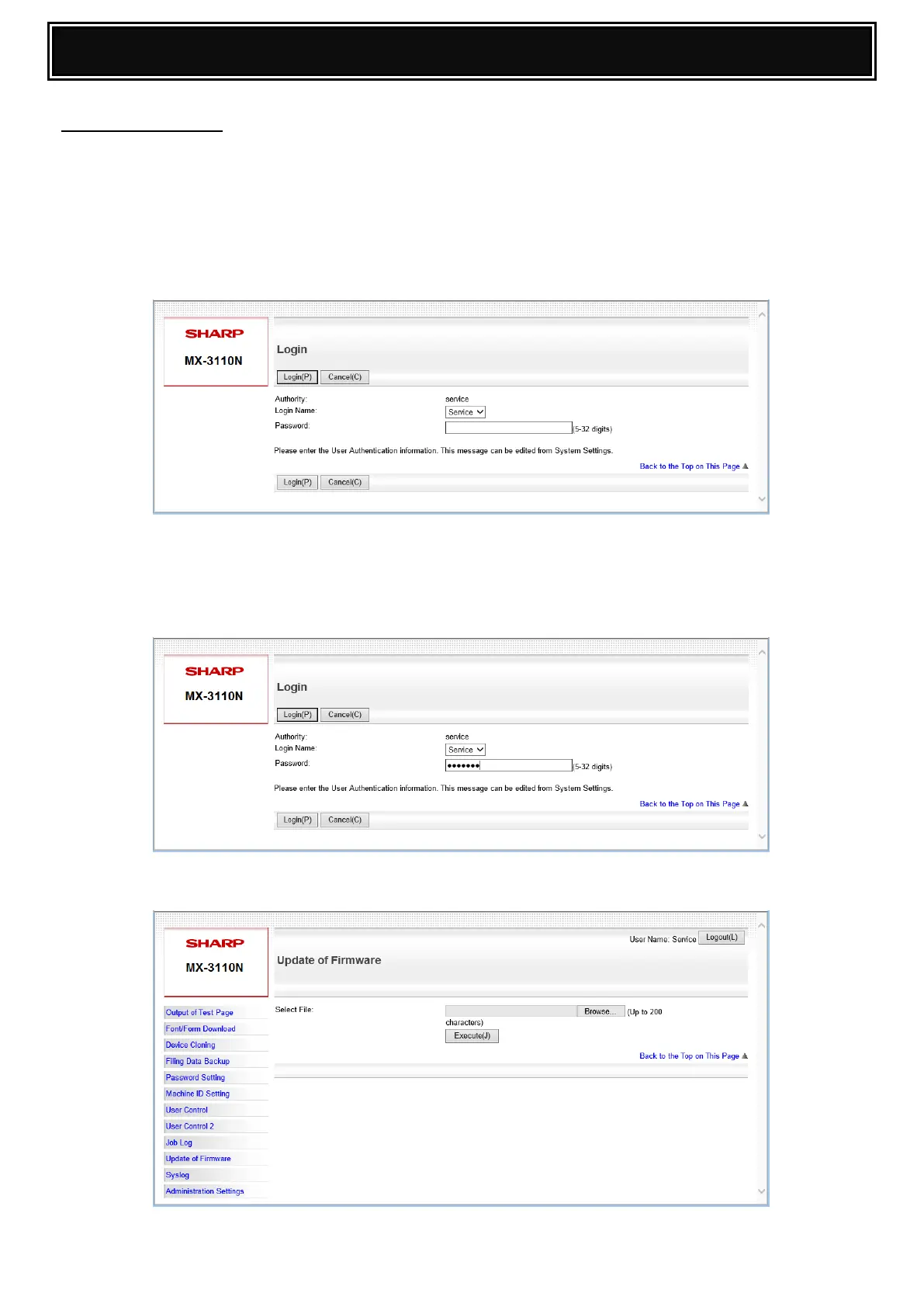 2. Select/Enter the “Service” Username and Password to access the Service Webpage and click