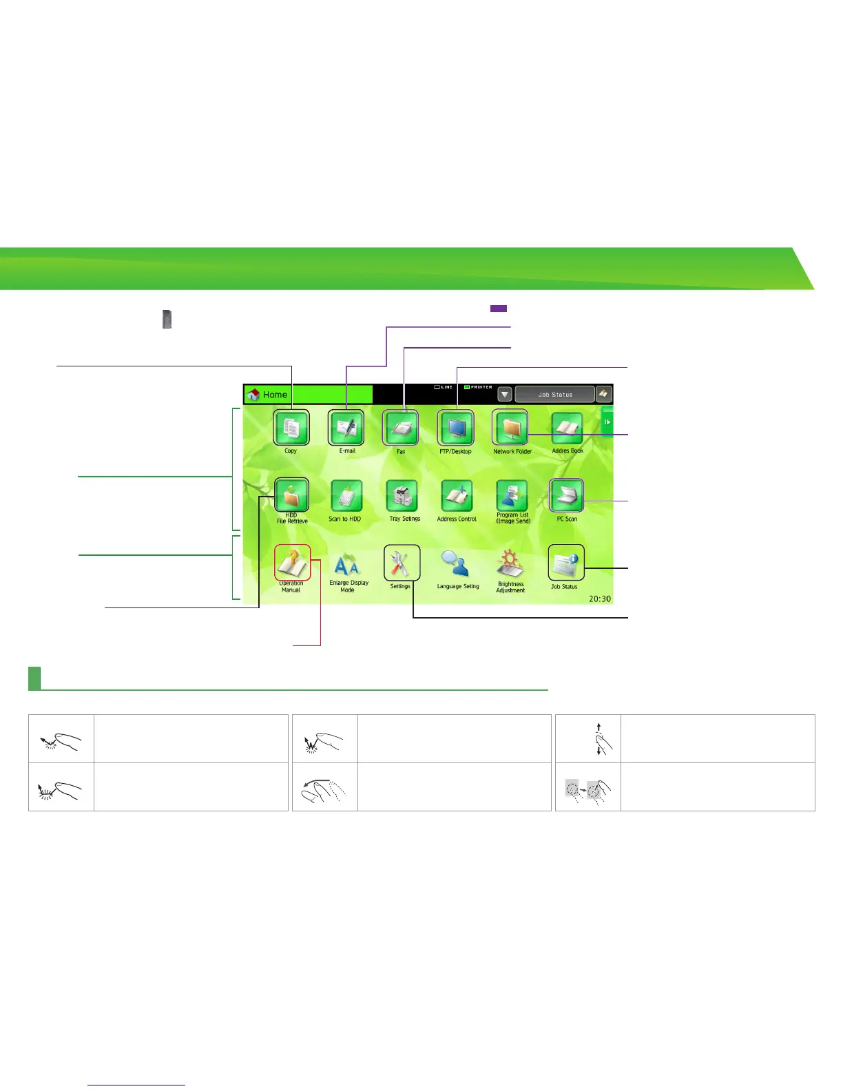 The home screen is the first screen to be displayed. Touch an icon to display the