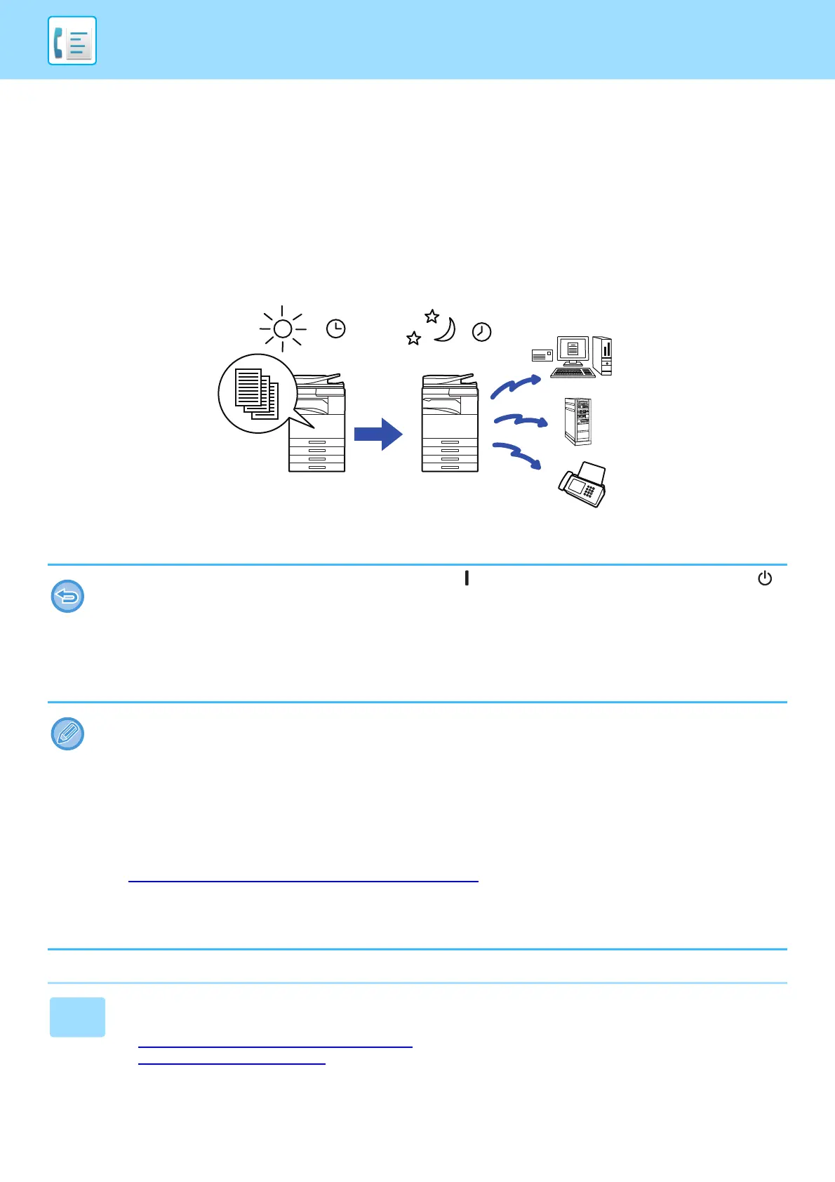 When a timer transmission is set, keep the main power switch " ". Transmission will not take place if the status is " "