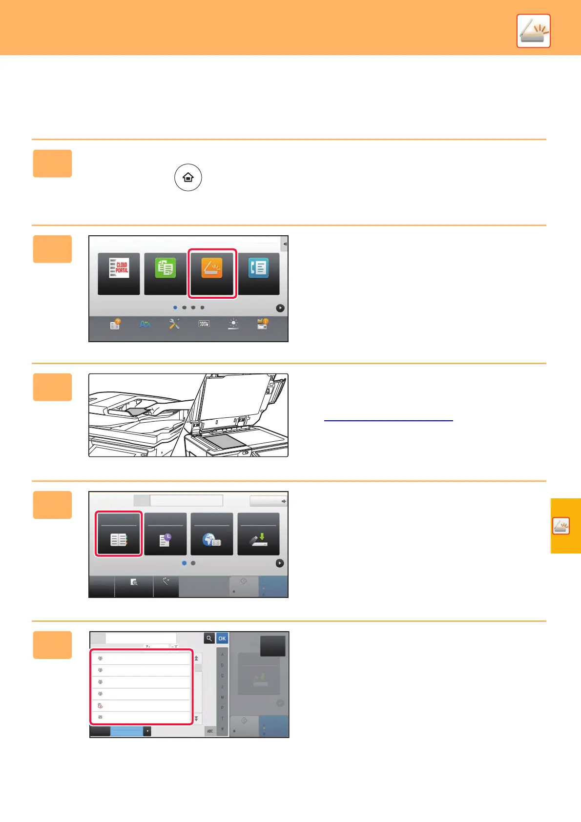 The procedure for sending a scanned file by E-mail to a destination stored in the address book is explained here.