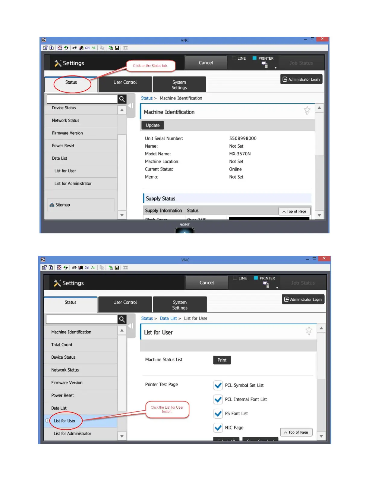 2. The Settings Menu screen will open. Click on the Status tab. (see the example below)