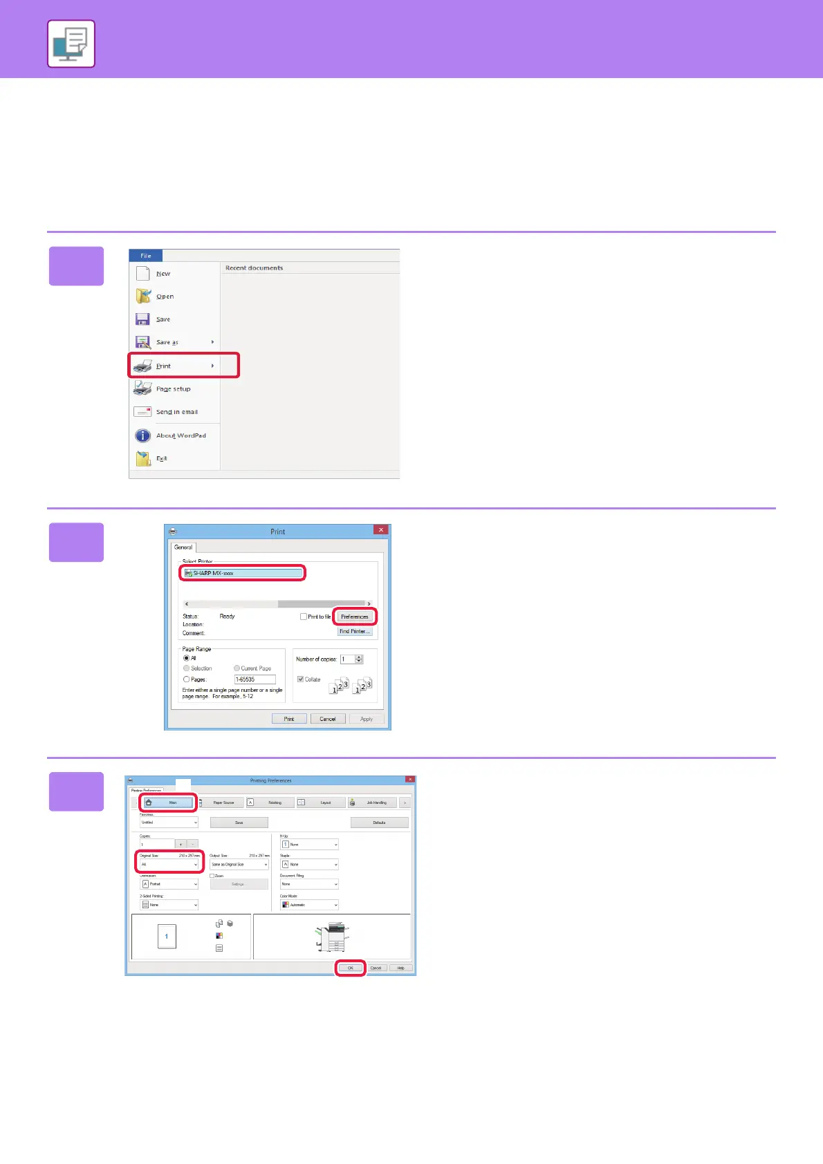 The following example explains how to print an A4 size document from "WordPad", which is a standard accessory