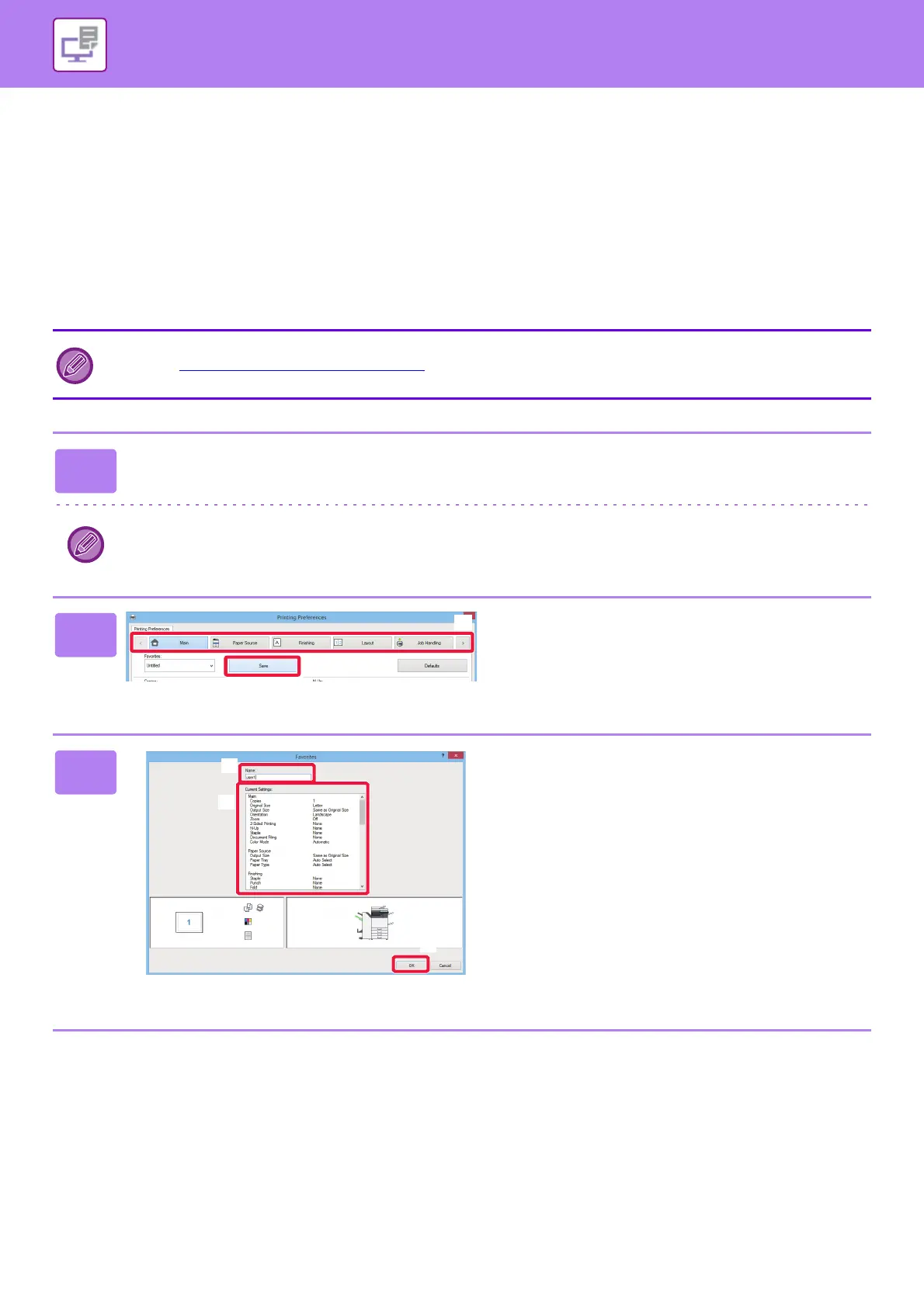Settings configured on each of the tabs at the time of printing can be saved as Favourite. Saving frequently used
