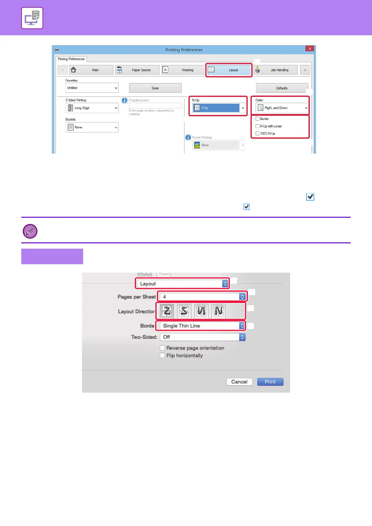 To print the first page normally (as a cover), select the [N-Up with cover] checkbox ( ).