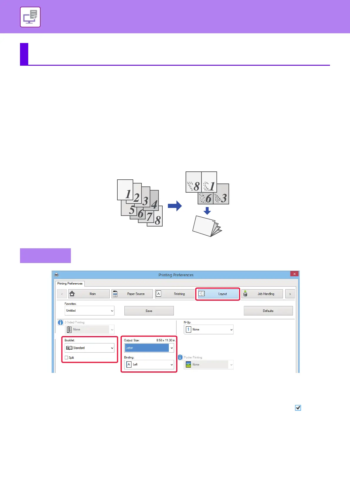 output into multiple sub-booklets that can each be stapled. When stacked, the sub-booklets will have the same page order as the original pages.