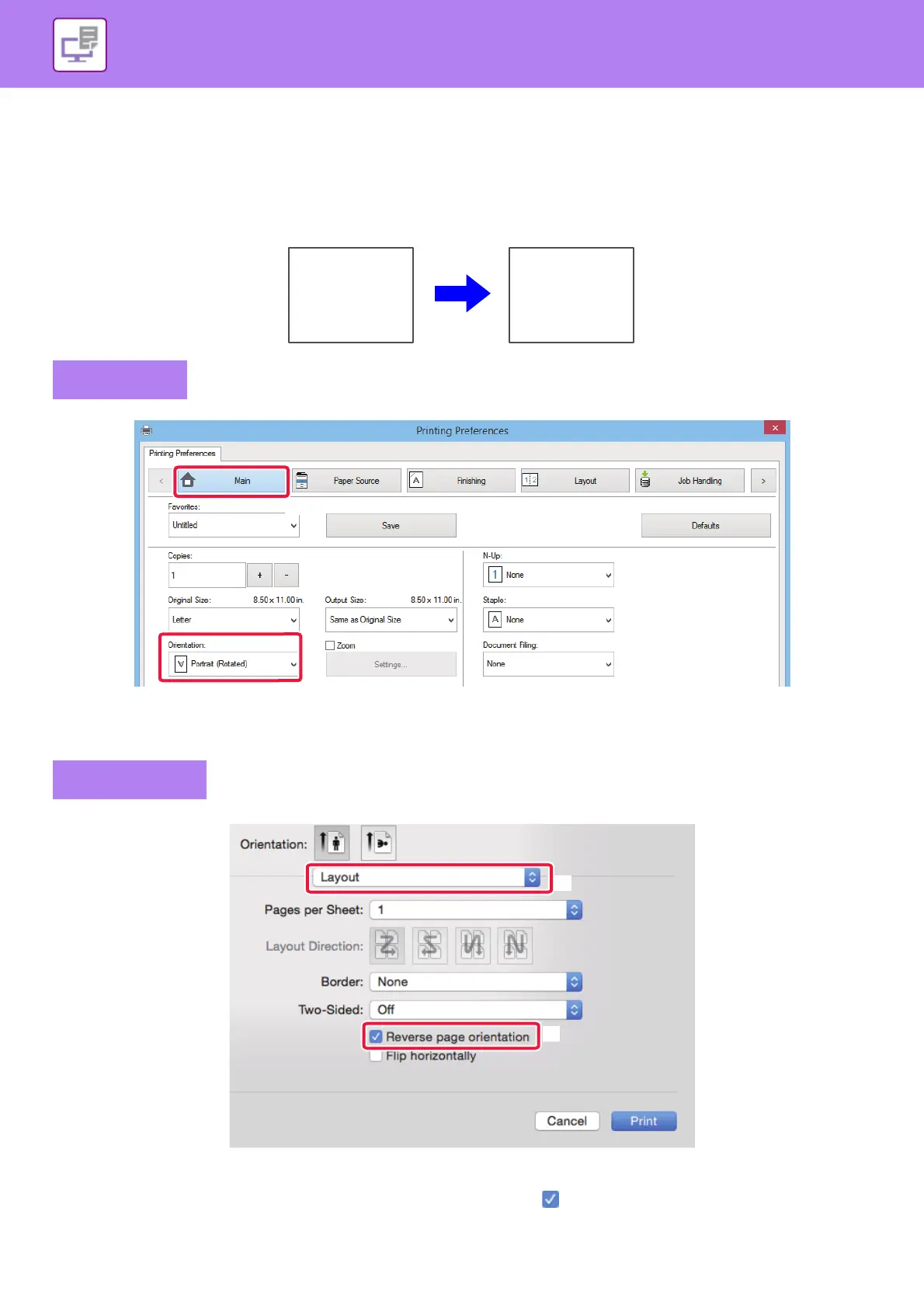 (2) Select [Portrait (Rotated)] or [Landscape (Rotated)] in "Orientation".
