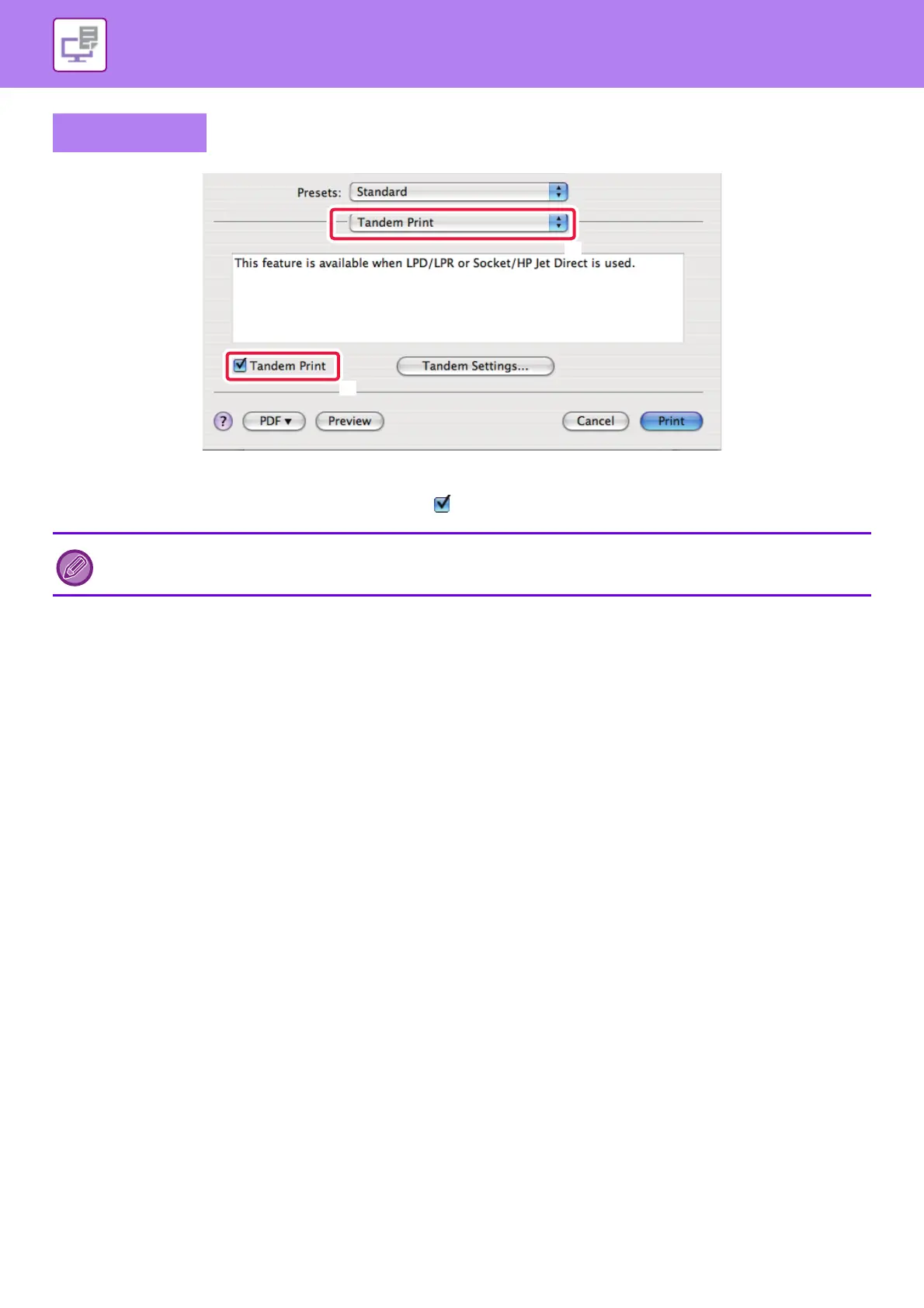 To use the tandem print function, you must select the protocol to be used as instructed in the message that appears when