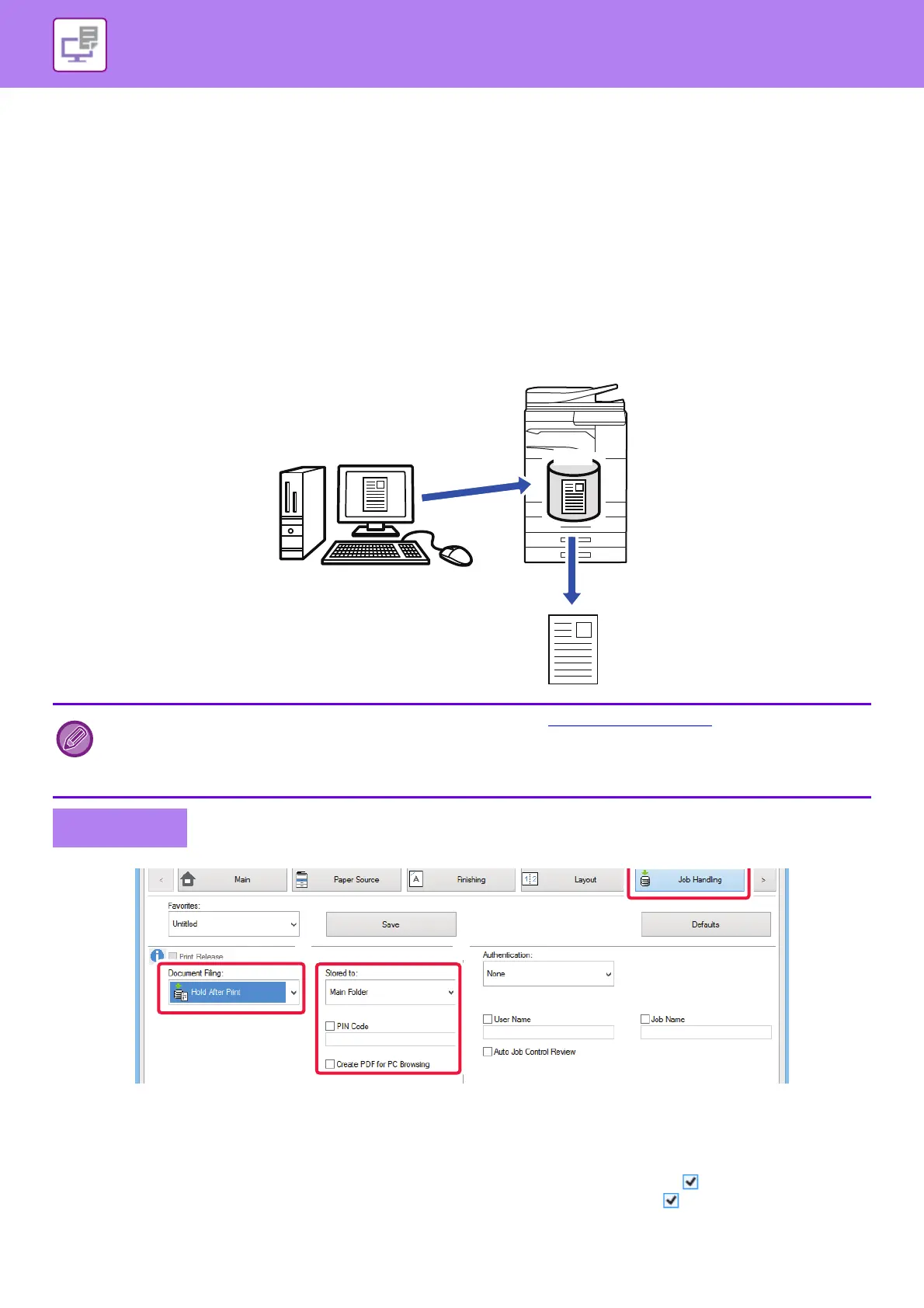 • [Document Filing] that can be set on the [Job Handling] tab can also be set on the [Main] tab.