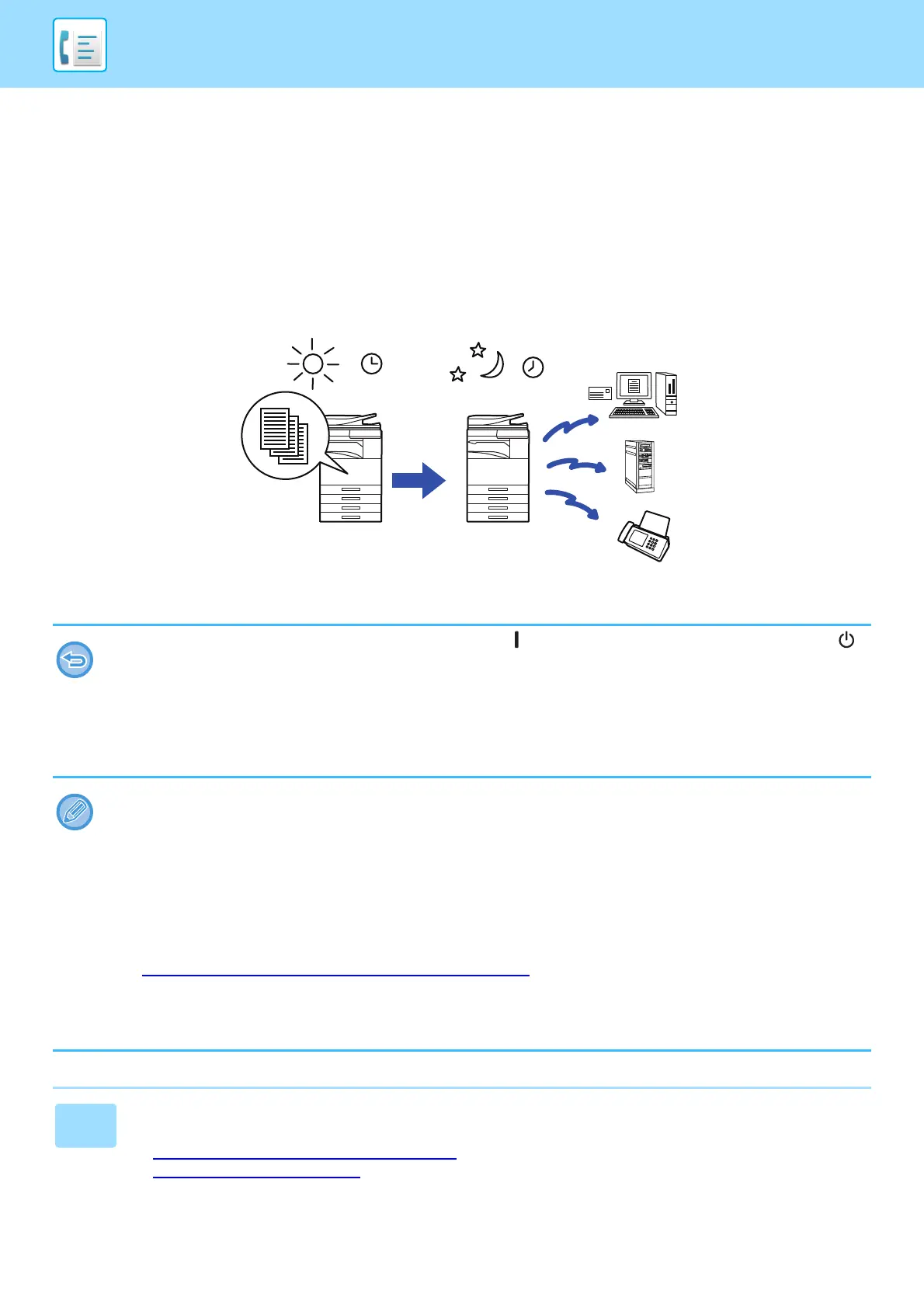 • When a timer transmission is set, keep the main power switch " ". Transmission will not take place if the status is " "
