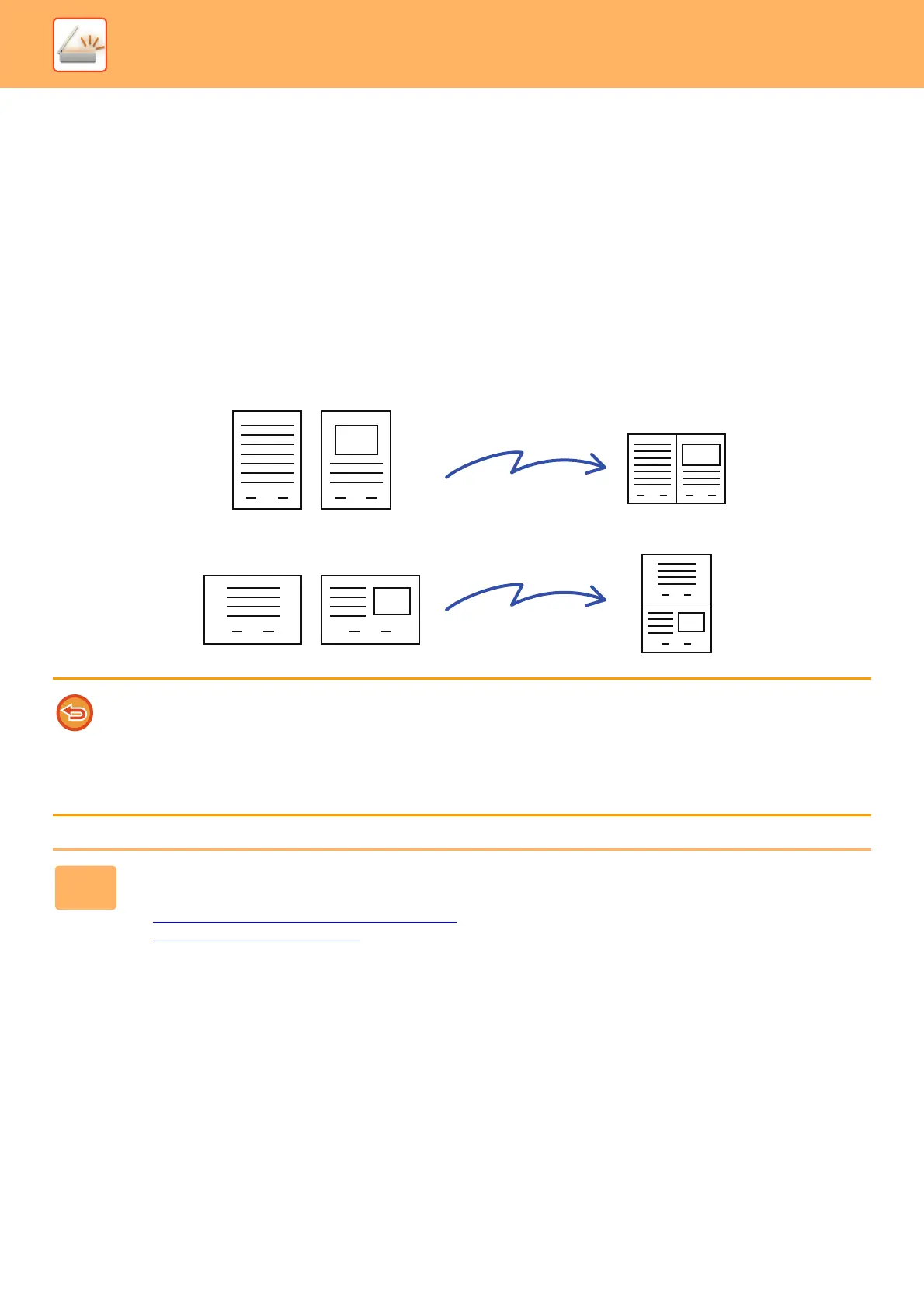 Reduce two original pages to the equal size and sent them as a single page. This function is convenient when you have