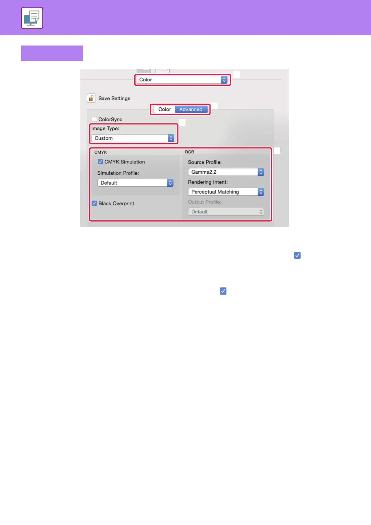 select [Custom] in "Image Type", select the [CMYK Simulation] checkbox ( ), and then select the desired setting.