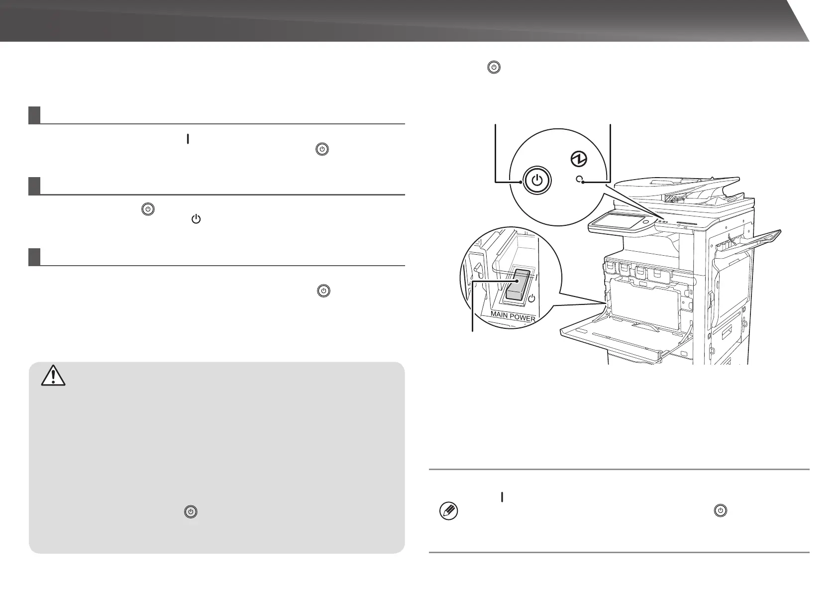 This machine has a main power switch, found at the bottom left after the front cover is opened, and a power button ( ), located on the operation panel.